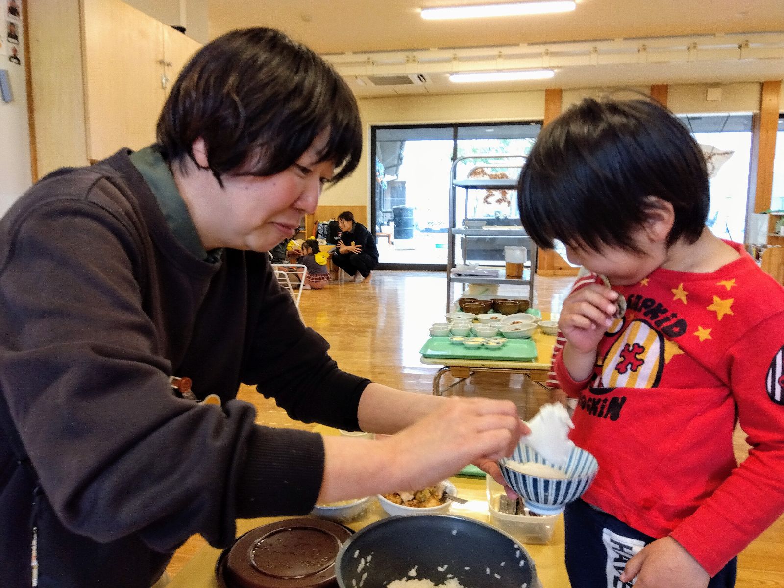 お昼は児童発達支援のマンスリーを利用している子どもたちの給食のサポートをしながら、子どもたちの様子を見て、できるだけ子どもと関わる時間をもつようにしています。