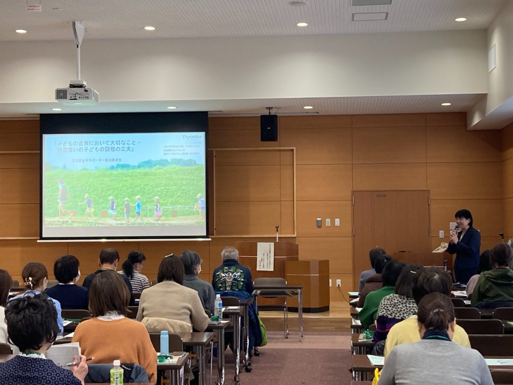 2024年3月、足立区の食育サポーター養成講習会にて、読売ランド前どろんこ保育園の松久保施設長が「子どもの食育において大切なこと・野菜嫌いの子どもの調理の工夫」をテーマに研修を行いました。