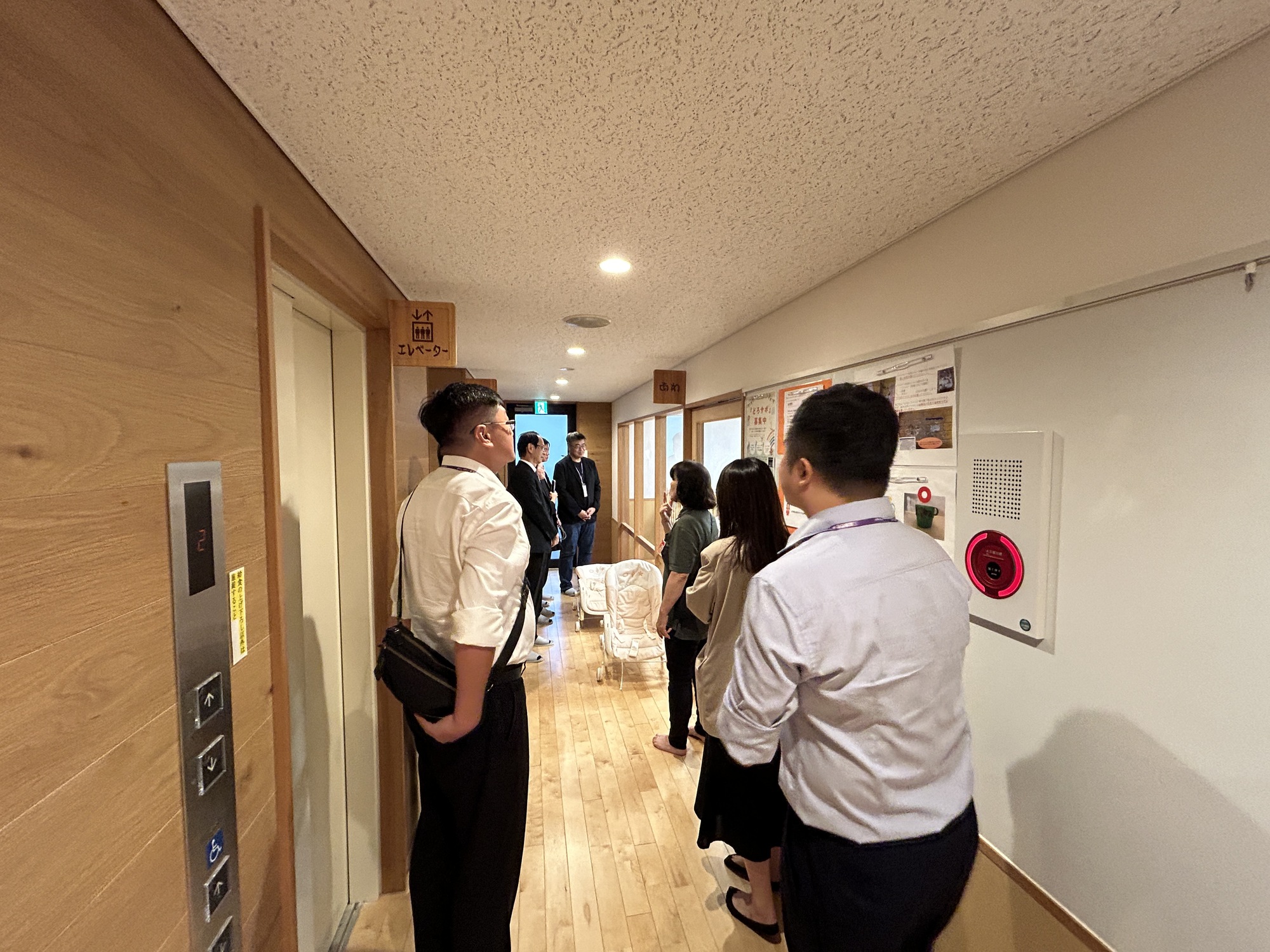 施設長の中村さんが案内する中で、一行が目に留めたのは各クラスの保育室の配置でした。台湾の施設設備基準は、月齢の低い子どもは1階を優先的に使用し、使用面積が不足する場合は2階を使用することができると定めています。中目黒どろんこ保育園では、1階に3・4・5歳児クラス、2階に0・1・2歳児クラスの配置であることに驚いていました。