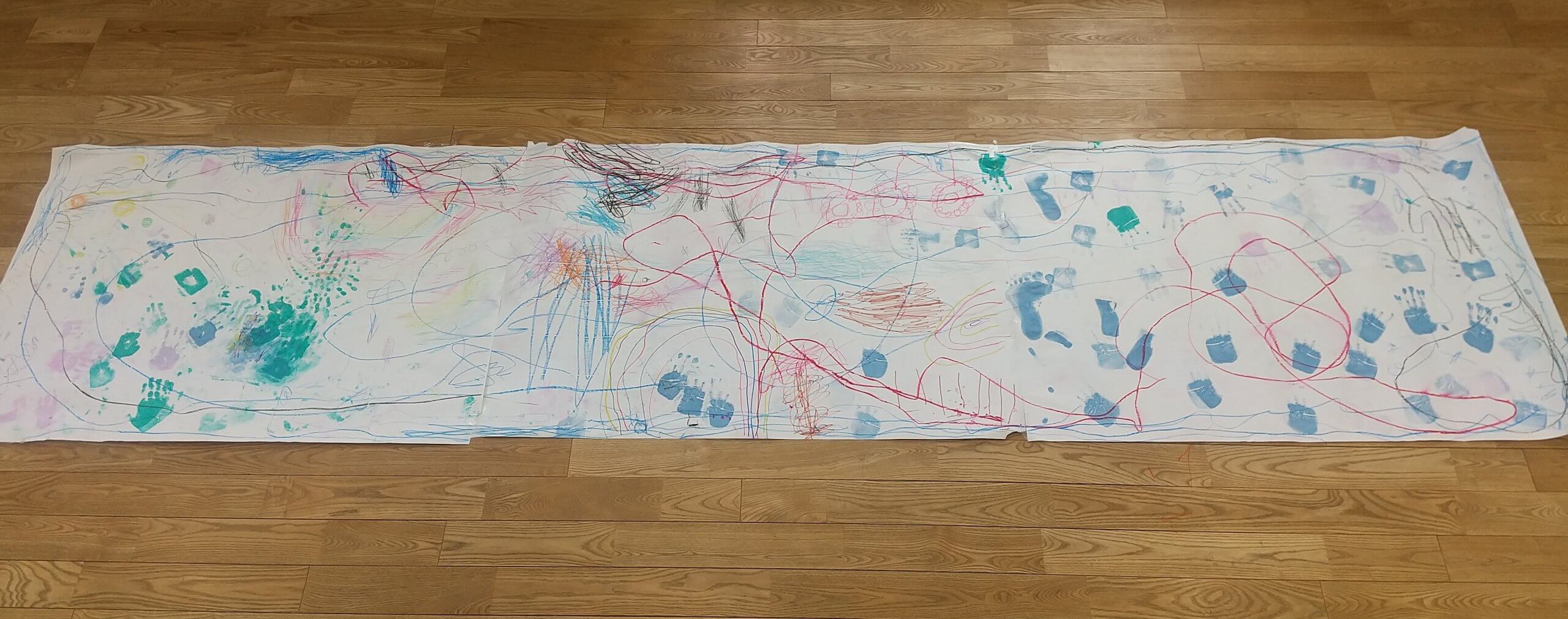 こちらは今年度はじまったあるグループ。「景色、天気、お友だち、スタッフと話したこと」を、模造紙3枚分の大きな紙を使って自由表現活動をしました。