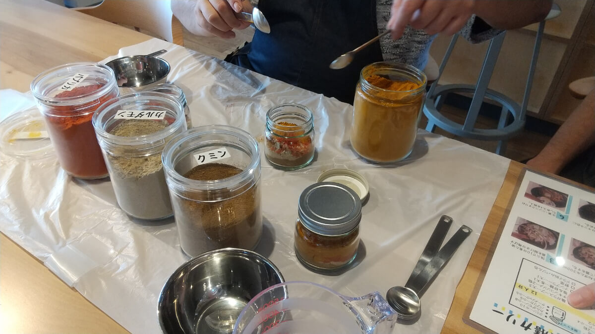 この写真は、9月1日にオープンするTUMUGI CAFEで提供する「夏野菜とチキンの薬膳カリー」で使用するスパイスを調合しているところです。「おいしい」という笑顔のために、真心こめて丁寧に調合していきます。