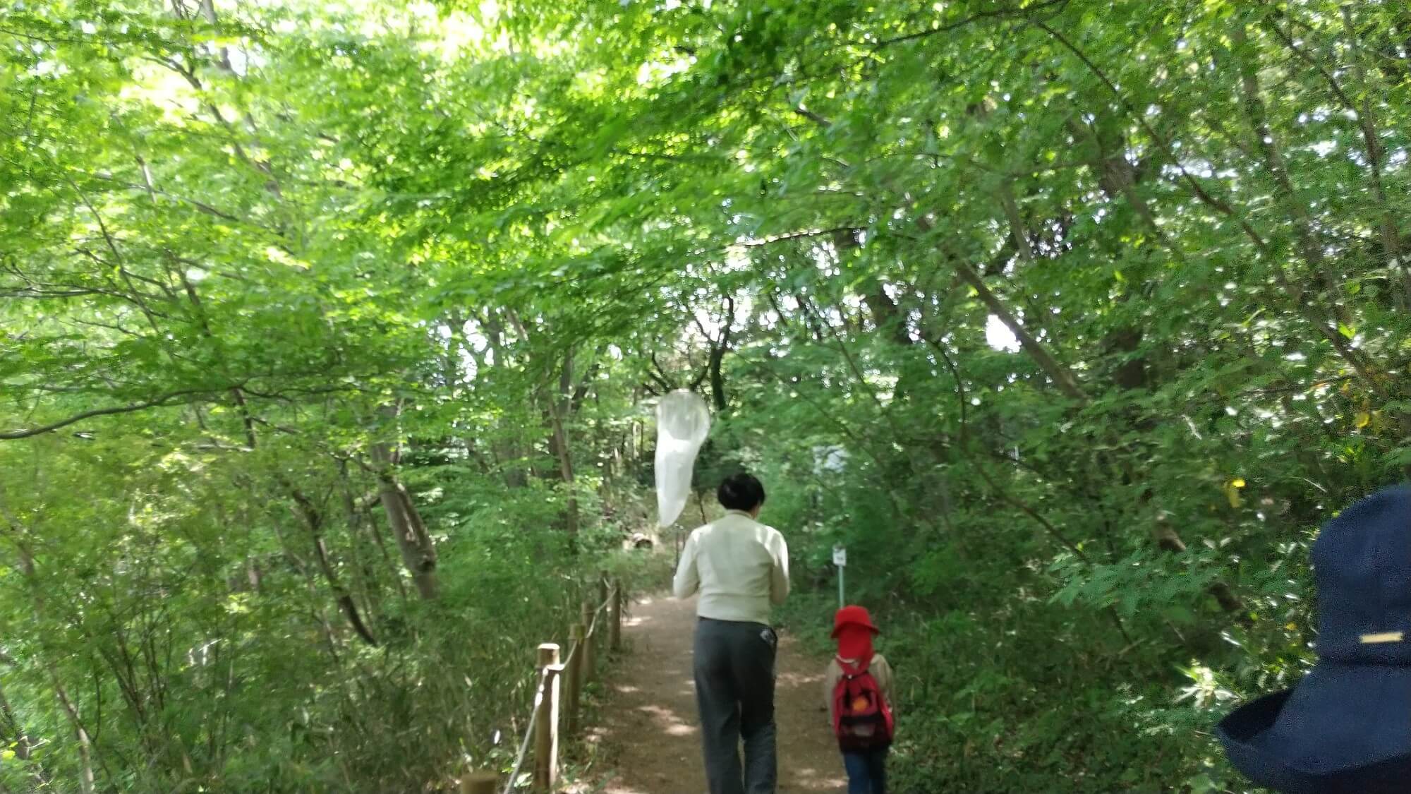 当日は、とても良い天気で、爽やかな風が吹く中、自然学習センターの職員の方の案内で園内を散策しました。木陰は少しひんやりとしていて、葉っぱや土のとてもいい香りがしました。初めての相手や場所に緊張してドキドキしている子もいましたが、林の中を歩くにつれてリラックスして、「あ、てんとう虫だ」「鳥の声がする。どこにいるのかな」と周りの様子に気付くことができるようになりました。