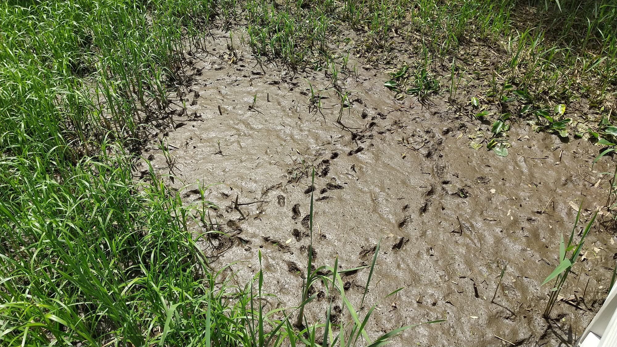 「この長い指5本の足跡は何の動物の足跡でしょうか」「何かなぁ」とみんなで考えました。「きつねかな」「とりかな」正解は、アライグマの足跡でした。