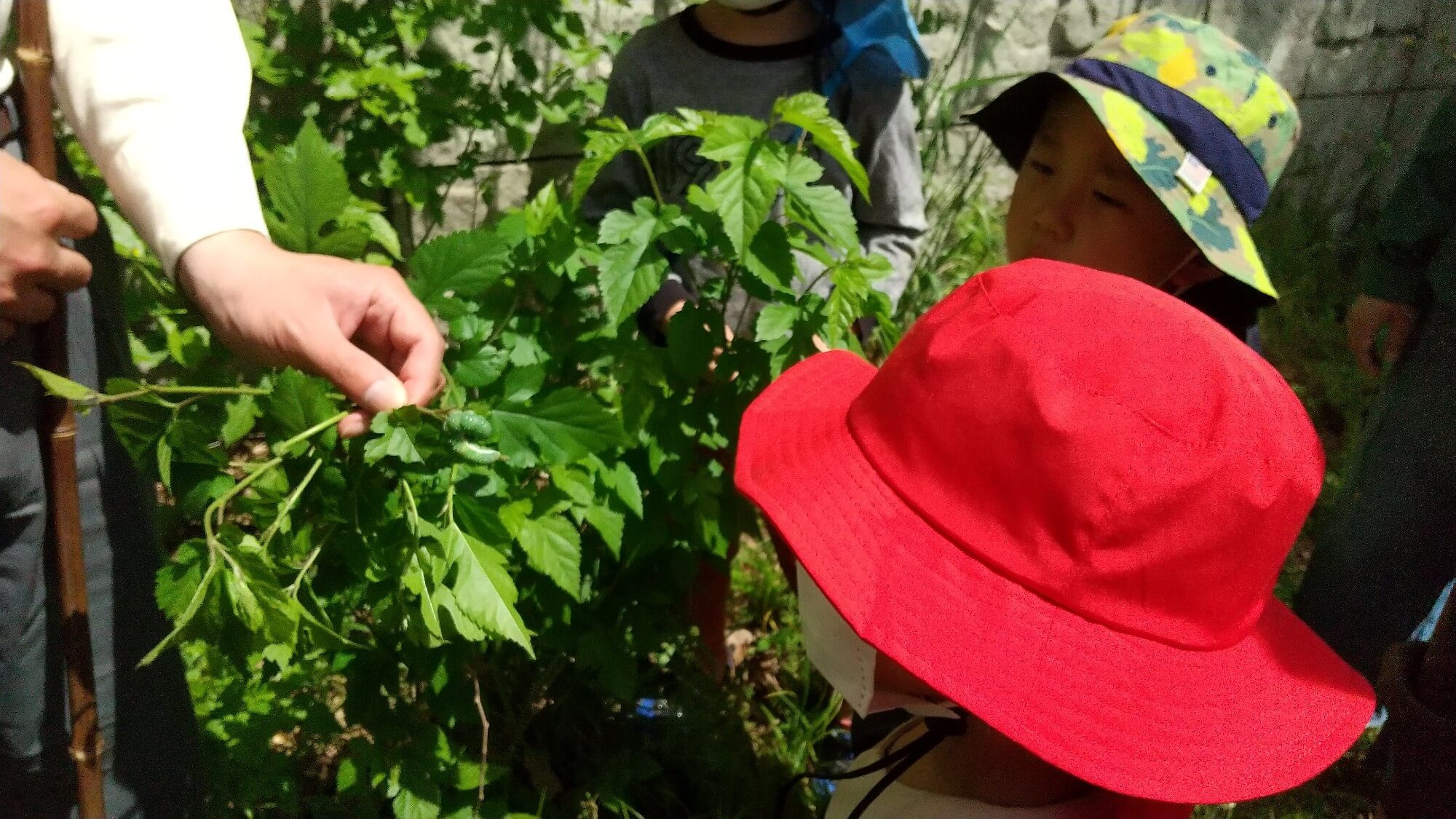 子どもたちの指よりも太い緑色の大きな青虫は、細い枝にしがみついていて、枝を指ではじくと大きくゆらゆら揺れていました。青虫の見た目がふにふにと柔らかそうで、思わず触りたくなるほどでした。