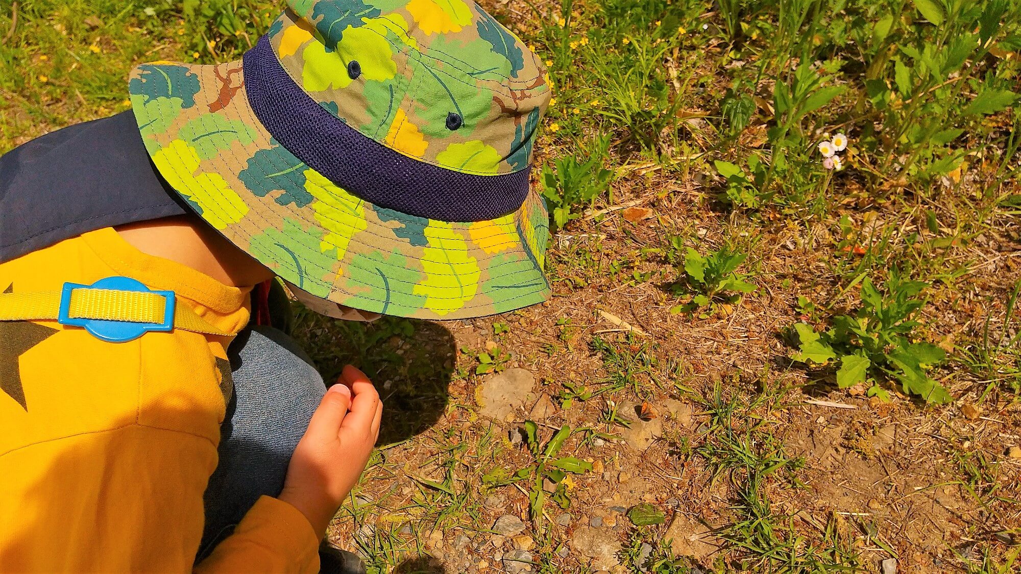 地面の茶色に溶け込むようにとまっていたオレンジ色のちょうも見つけました。子どもたちは、普段歩いている道と違う、砂利や落ち葉の道を、何度も行ったり来たりして、音や感触を味わっていました。
