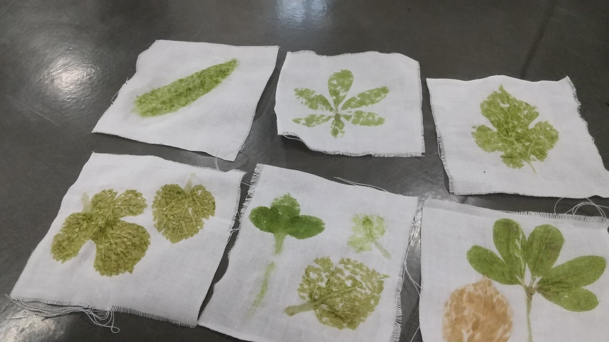 たくさん歩き、水分補給をしてリフレッシュした後は、各自が採取したお気に入りの葉っぱでたたき染めをしました。協力して叩いたり、できたものを互いに見せ合って違いを楽しんだりしました。形も色も違って、世界で一つしかない作品ができあがりました。