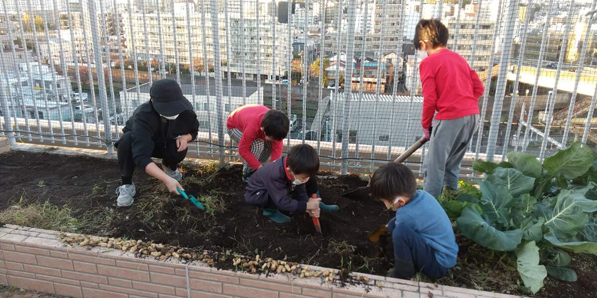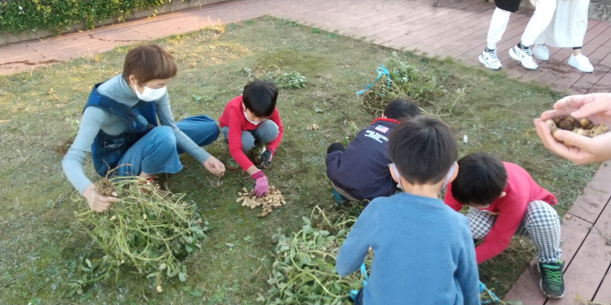 グループメンバーの中には、ピーナッツアレルギーを持っていて、落花生を触ったり食べたりすることができない子どももいました。今回の収穫にあたり、事前にグループの子どもたちでアレルギーに関する絵本を読み、アレルギーの理解を深める時間をもちました。保護者の方とも予め相談させていただき、対象の子は当日、服薬や手袋の装着など安全への配慮をして、みんなと一緒に収穫に参加しました。日々の活動においても、「~だからできない」と諦めるのではなく「どうすればできるか」という視点を大切にしながら、様々な体験の場をつくっていきたいと思います。