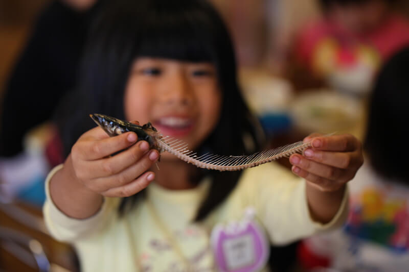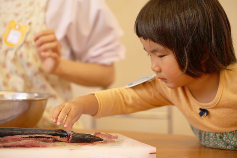 しかし、ここで終わらないのがどろんこ流。子どもたちの目の前で、秋刀魚の解体ショーを始めます。紙芝居に出てきた「さんま君」が目の前で解体されるのを見て、「さんま君かわいそう!」の声が飛び交いました。びっくりして口が塞がらなかったり、友達と抱き合ったり、目を隠したり・・・命をいただく重みを一瞬で体感したようでした。