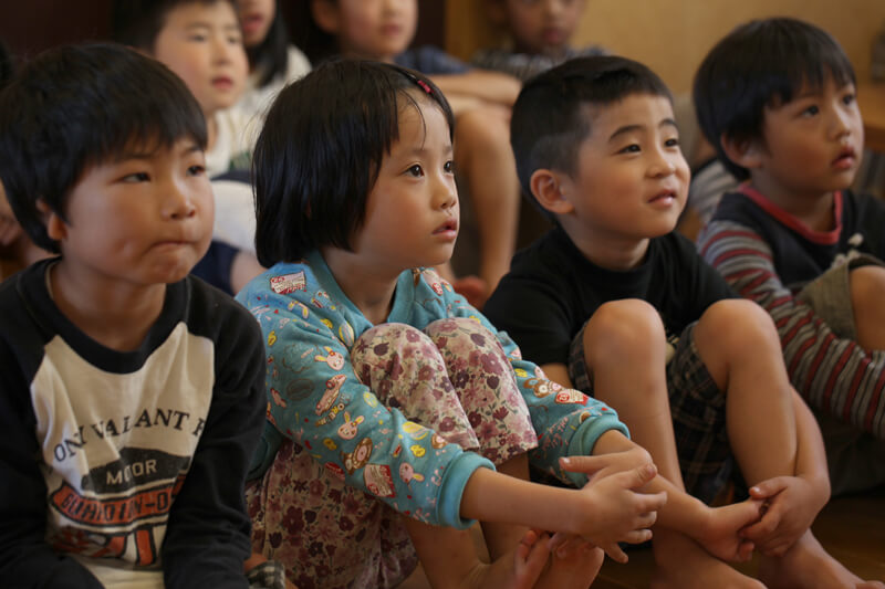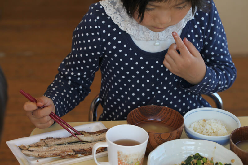 まずは先生お手製の紙芝居。みんな主人公の「さんま君」に釘付けです。いただきますは誰に対して言うのか、食事のマナーや、好き嫌いをせず最後まできちんと食べることの大切さを学びました。
