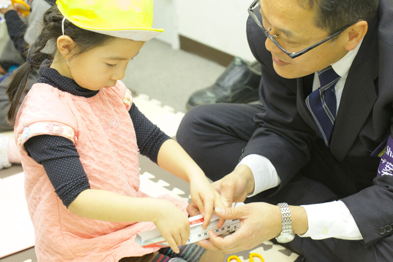 最後に駅長さんから、一人ひとり作った新幹線を手渡ししてもらい、貴重な体験活動は終了しました。