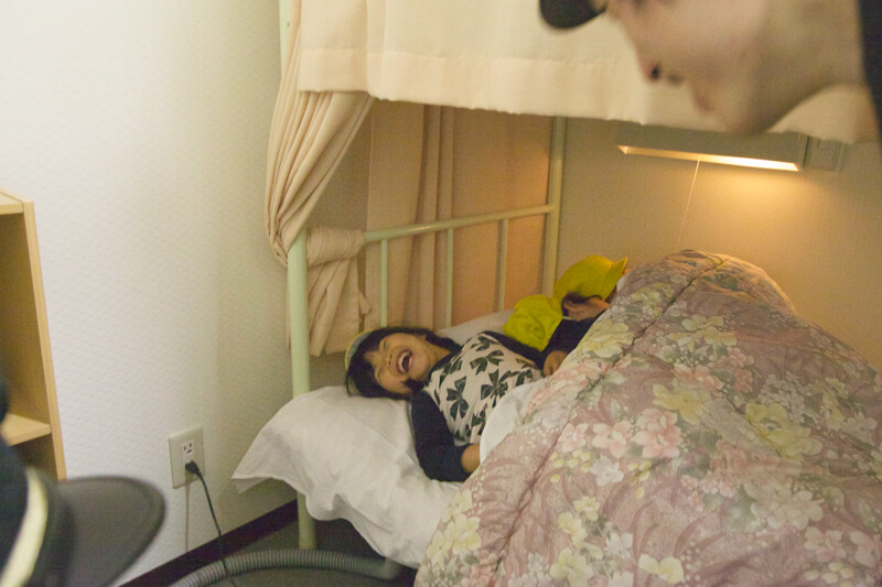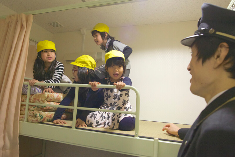今回は特別に、駅員さんの事務室にも入らせてもらいました。仮眠室では、宿直用のベッドで大はしゃぎ!二段ベッドに上り「カーテン閉めて!開けないで!」と、しばらく出てきません。寝坊防止の定刻起床装置を起動してもらうと、突然膨らむベッドに「キャ〜っ!!」っと大歓声。