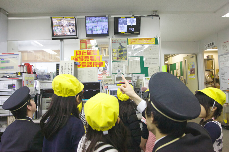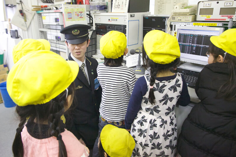 ほかにも、事務所には複数のモニターやマイクなど、子どもたちの目を引くものがいっぱい!マイクの前に立って、「次はトウキョウです。次はー、トウキョウです。」とアナウンスの真似をする子も。駅をぐるりと一回りした頃には、駅員さんともすっかり仲良しになりました。