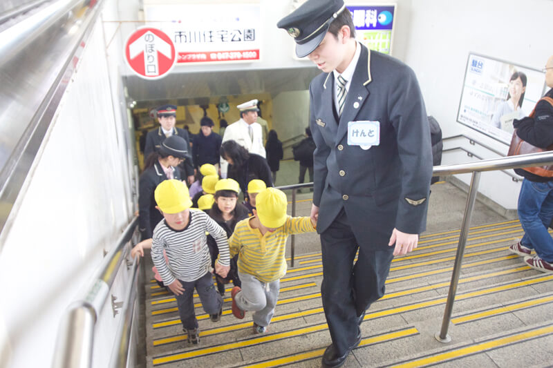 次は、駅中探索。駅員さんと手をつないで、駅のいろいろなところを歩きました。切符の買い方を教わったり、エスカレーターに乗ってホームまで行ってみたり。