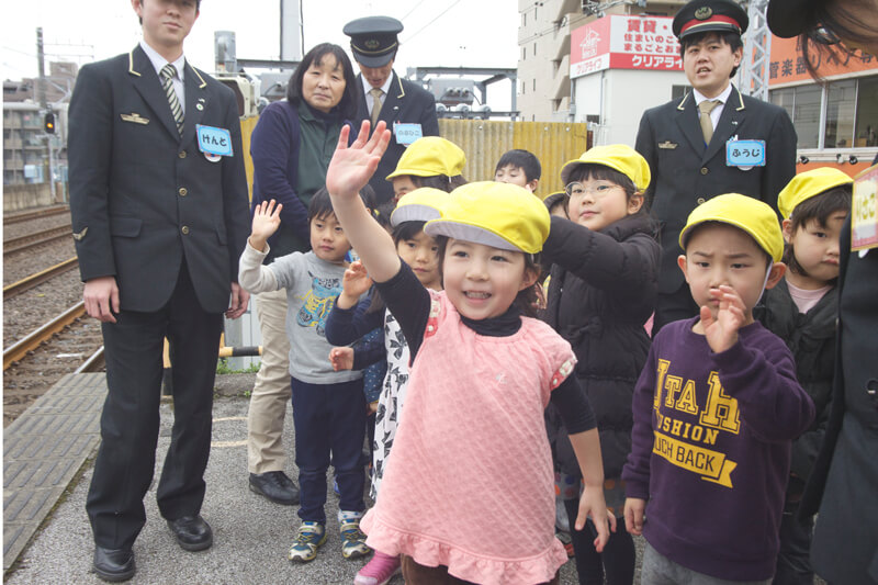 探索の後は、ホームを出たり入ったりする電車をみんなで見学。出て行く電車の運転手さんに、大きく手を振りました。