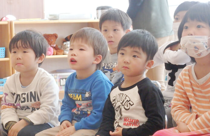 食べ物一つひとつには大切なメッセージがあるんですね。毎日、おうちの食卓に並ぶごはんも同じ。じゃがいもやピーマンやキャベツやニンジンにも、「元気な子に育ってほしい」という作ってくれた人の気持ちが込められているんですよ。それはお昼ごはんを作ってくれる調理師さんや、献立を考えてくれる栄養士さんも同じです。そんな保育士の熱弁に、耳を傾ける子どもたち。