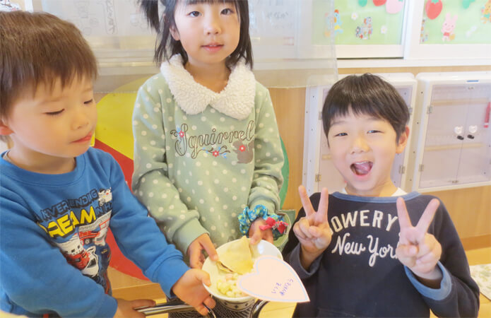 春は新しい始まりの季節。4月から小学校に進むこめ組さん(5歳児)とはもうすぐお別れです。そこでむぎ組さん(3歳児)・だいず組さん(4歳児)の子どもたちが、今までの感謝の気持ちを込めて、さくら餅を作り、卒園するこめ組さん一人ひとりにプレゼントしました。