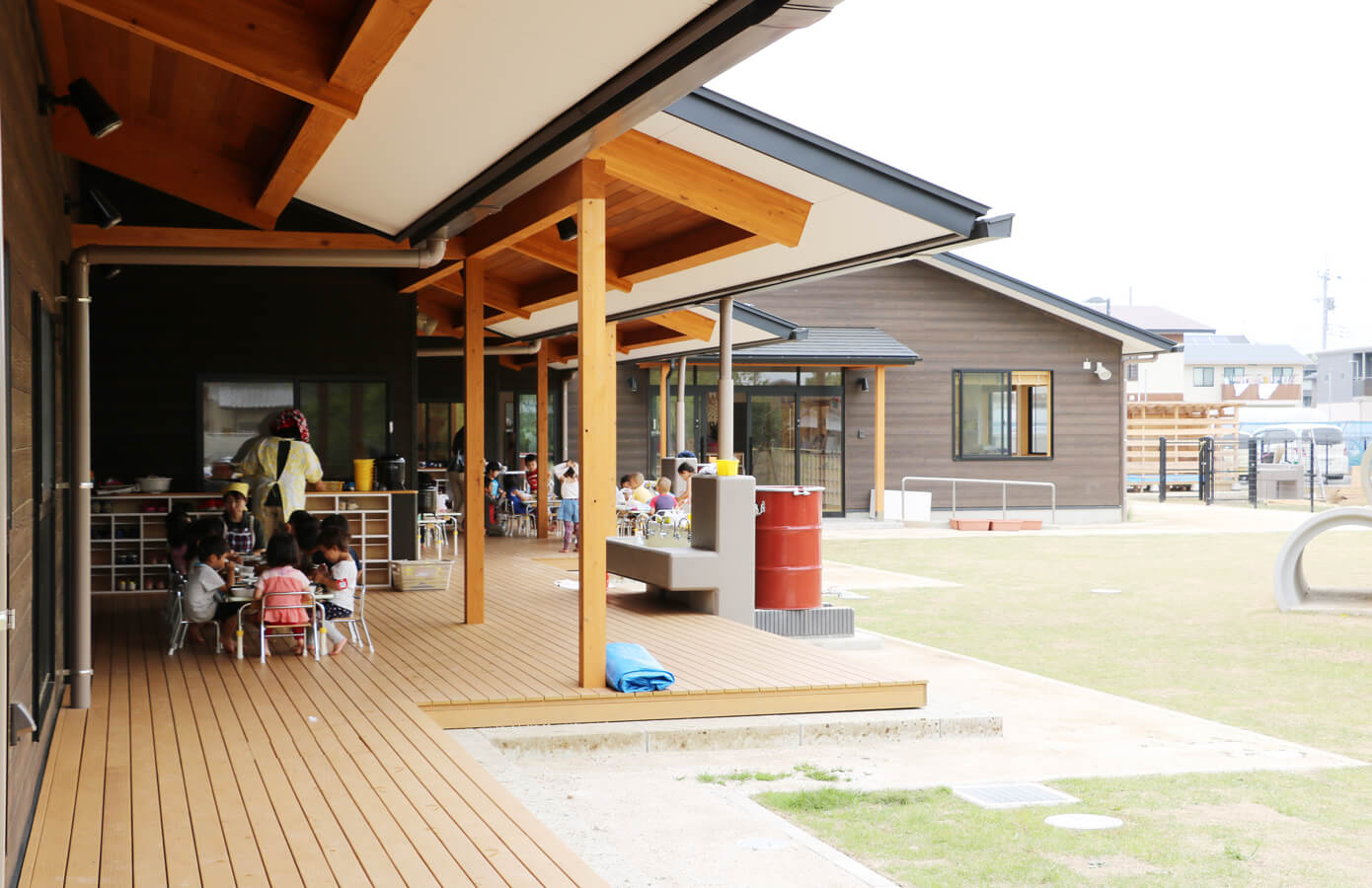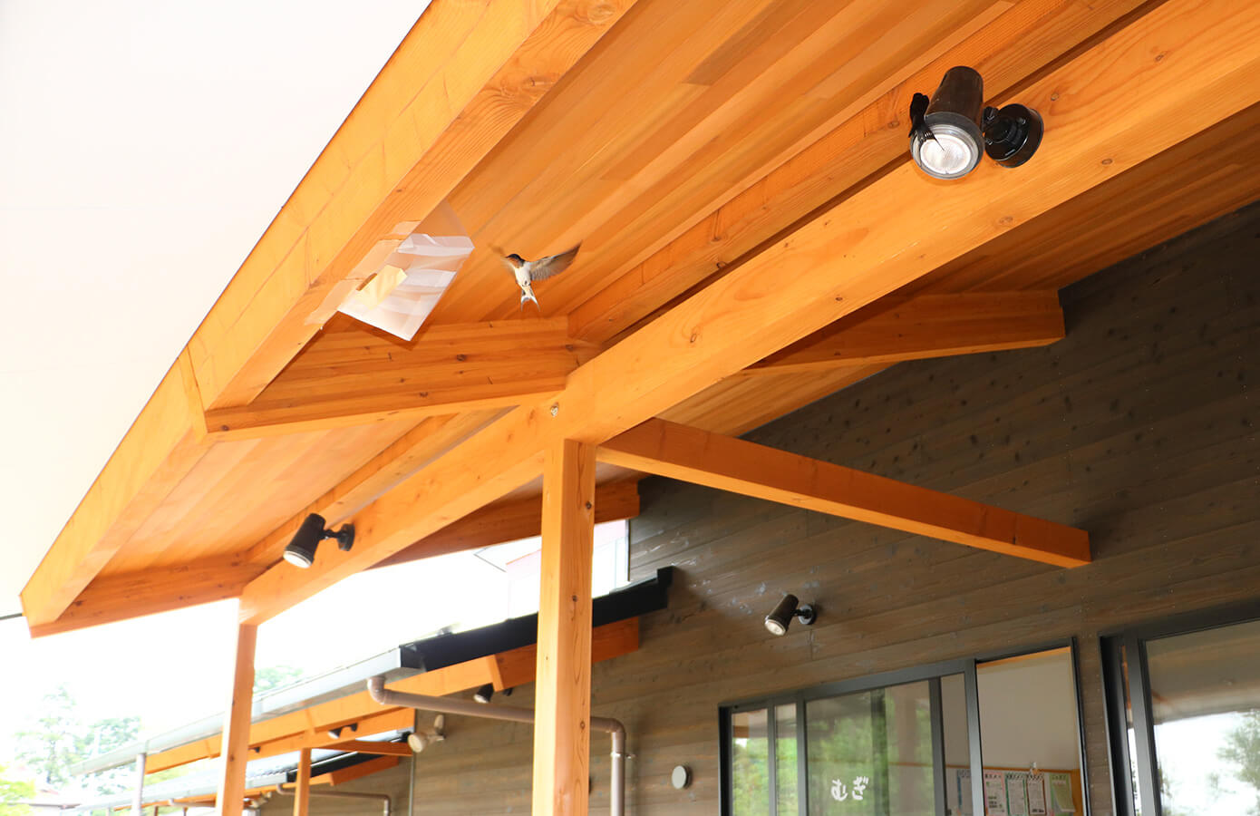 日々触れる建物をすべて木でつくることにより、子どもたちにも親しみやすい空間となりました。平屋なので、階段で転んで怪我をする心配もありません。園庭に面してぐるっと縁側が囲むことで内・外を隔てるものがなくなり、子どもたちはいつでも自由に外へ飛び出して遊べるようになっています。