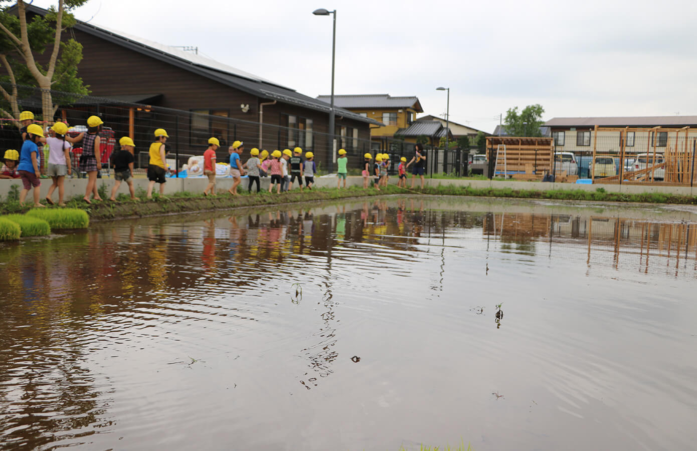 この場所は、もともと田んぼと畑が広がる広大な農地でした。原風景をできるだけ残したいという思いから、田んぼと畑の一部を園庭の隣にそのまま残すことになったのです。その結果、田んぼで子どもたちが自ら田植えや稲刈りをして収穫されたお米を食べる、という園内で完結する食物サイクルができました。食育だけでなく、田んぼにはカエルやアメンボ、鳥などさまざまな生き物が集まり、自然の営みをリアルタイムで体験できるようにもなっています。