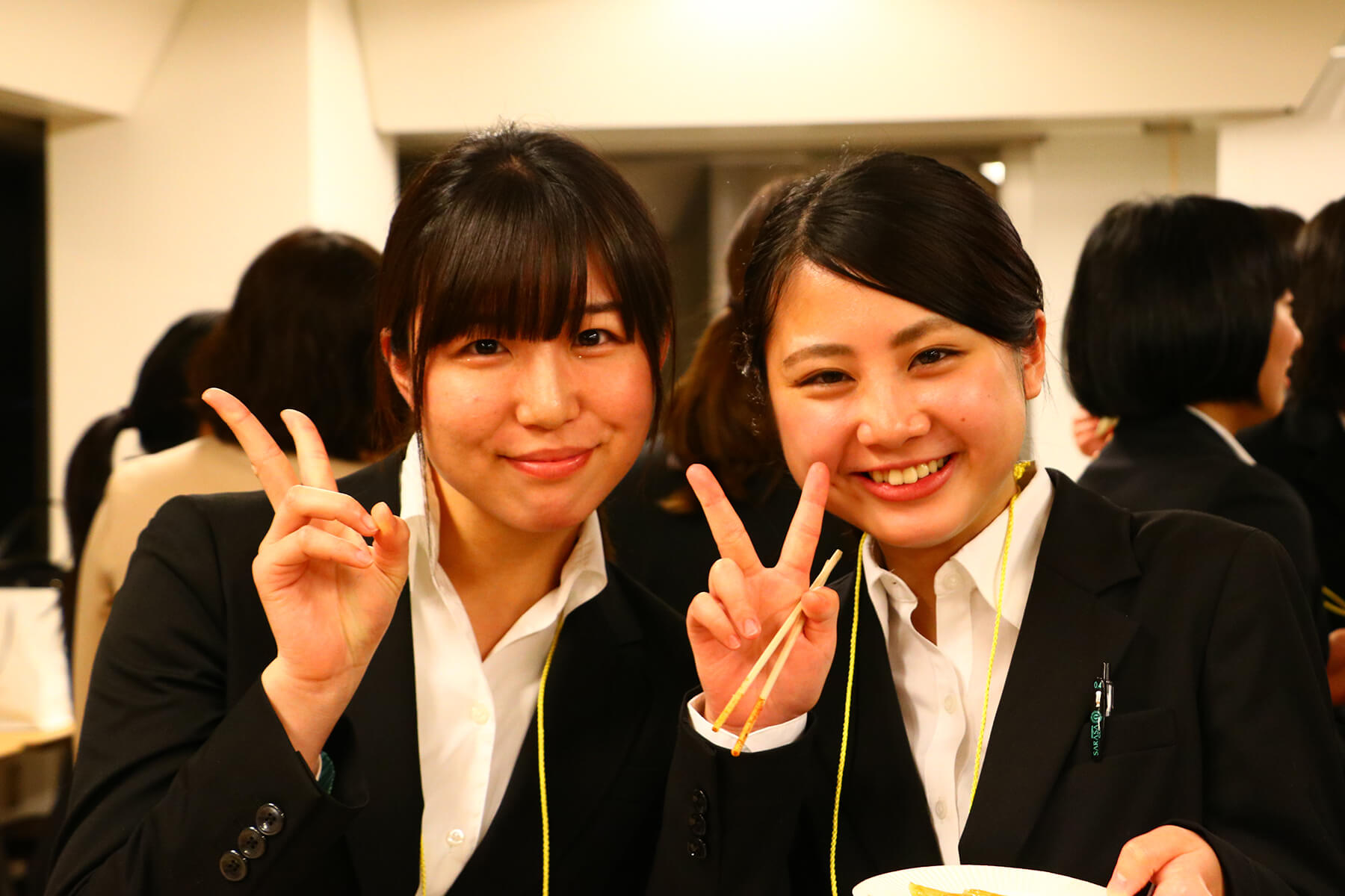 懇親会は、理事長からのメッセージや先輩社員の挨拶などを経て、ジュースで乾杯。形式的なのはそこまでで、その後、立食による同期同士の初めての交流が始まります。
