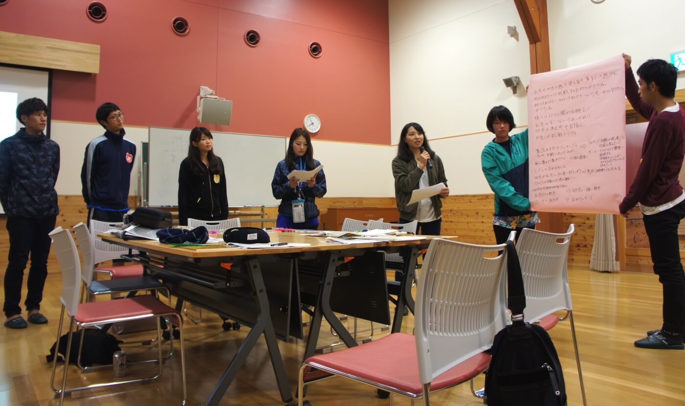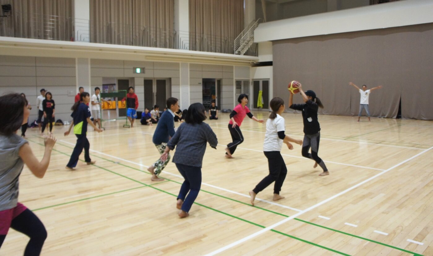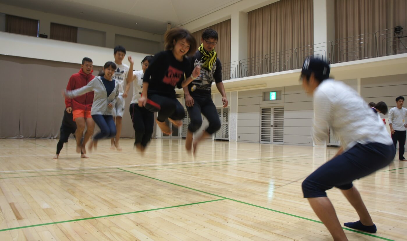 さて、当日です。宿泊施設に到着後、まず最初のプログラムはスポーツ大会。大縄跳びにポートボール、ドッヂボールにバドミントンと、約2時間にわたり4種目の競技に汗を流しました。チーム制で点数を競い、さながらミニ運動会の様相。「大人が楽しくないと、子どもも楽しめないはず。大人が、子ども時代に戻って楽しむことを思い出してもらいたかった。」と話す川村。保育士が童心にかえって真剣に競技に打ち込んだ甲斐あって「さまざまな園から集まった初対面の参加者同士がすぐに打ちとけ、団結力を高めることができた。(川村)」その次に控える今回の研修会の本丸、新保育所保育指針と「異年齢保育」についての勉強会にも、スムーズに移ることができたのでした。