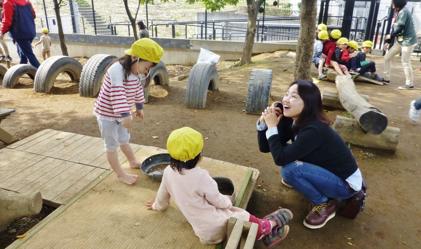 この日お迎えしたのは、韓国から来日した保育視察団のみなさん。自然体験を積極的に取り入れているどろんこ会の保育方針に興味を持っていただき、日本における視察先のひとつとして「朝霞どろんこ保育園」を訪問してくださいました。