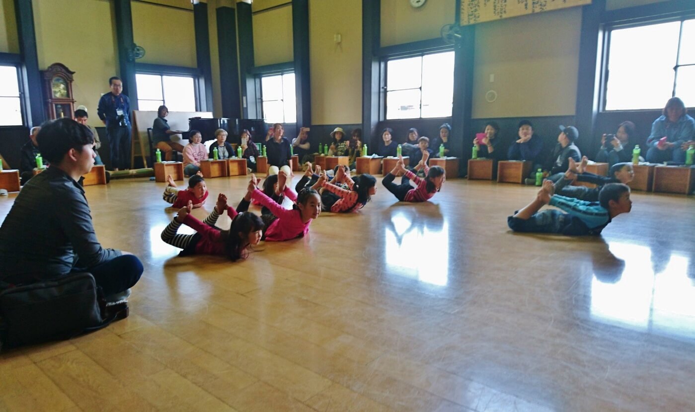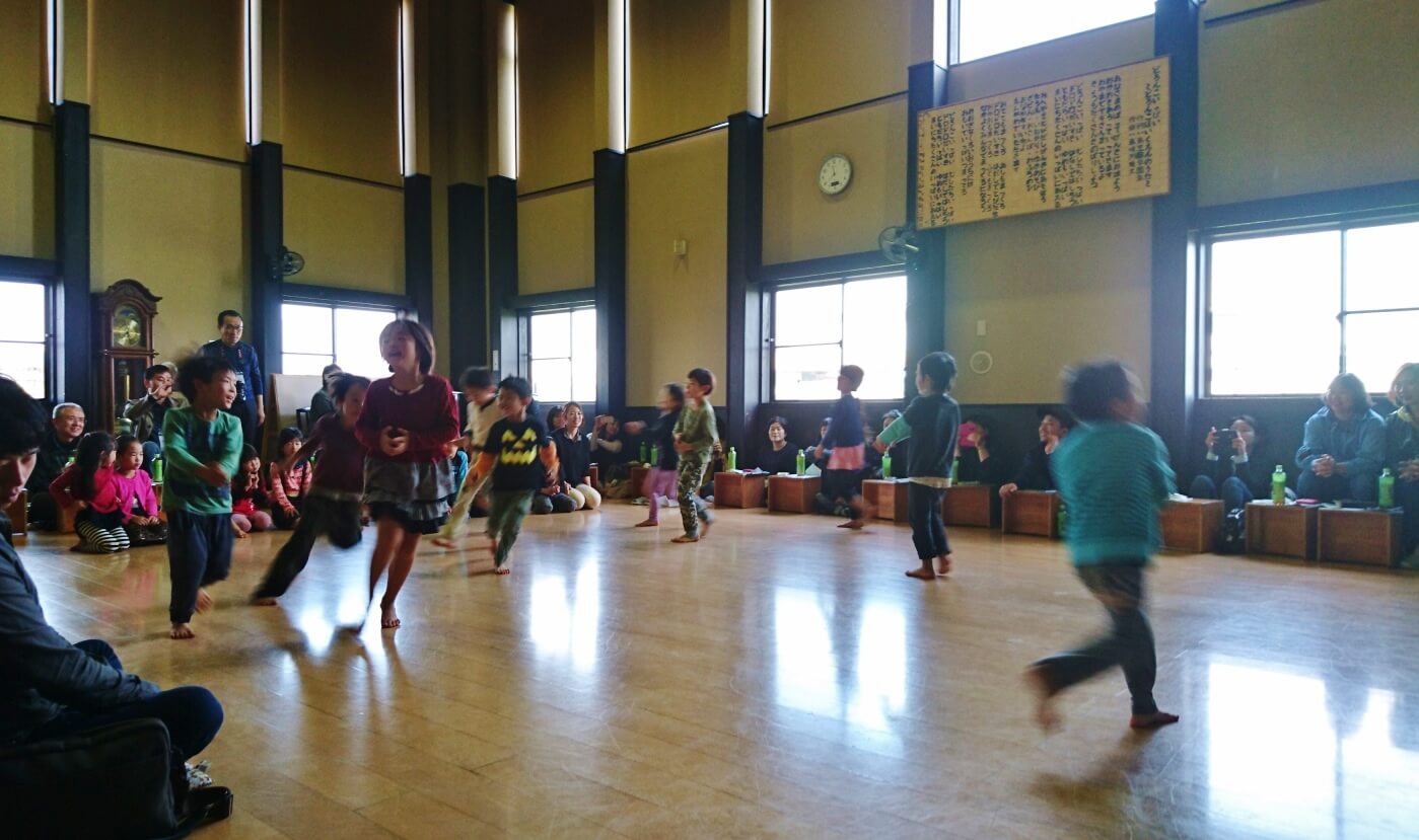 園内見学の後は、年長組が毎日実践している「さくら・さくらんぼリズム体操」を披露しました。ピアノの音に合わせて、ハイハイやスキップ、走ったり止まったりを繰り返すこの体操は、子どもたちの足腰を鍛え、リズム感を養うことを目的としています。