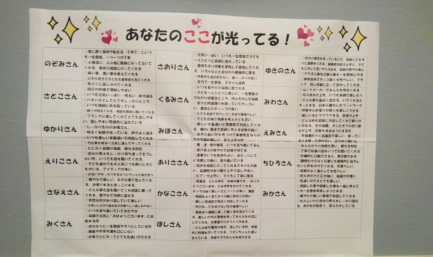 ここに掲示してあるのは、先日おこなった無記名アンケートの結果なのです。先生同士、互いに良いところを書き合ったものをまとめ直しました。意外と自分の評価と周りの評価って違っているんですよね。こんなところを見ていてくれたのか、とこれをみた職員はみんな、なかなか嬉しかったようですよ。