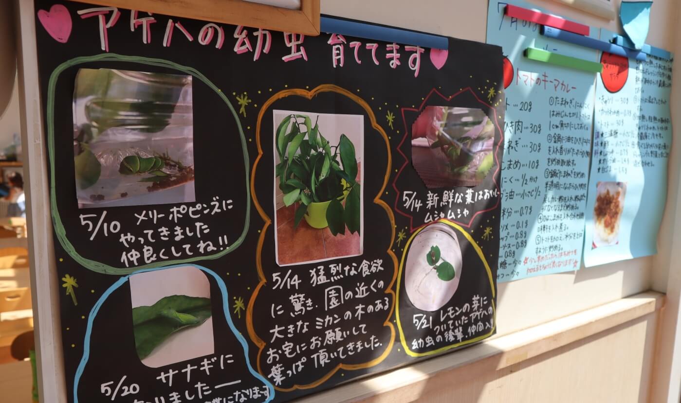 この春アオムシを育てたのですが、エサとなる柑橘系の木の葉の調達について悩んでいたら、一人の子が「お散歩コースにミカンがなっているおうちがあった」って言いだしたんです。そして、そのお宅を職員と園児で訪問し、ミカンの葉をいただく許可を取ってきたんです! ほかにも、近所の畑のおじさんに野菜や花をもらったり、お散歩の途中にぐずってしまった子がいたのですが、おばあちゃんが声をかけてくれたとたん泣き止んで元気に歩き出したり。普段から地域の人との交流を大事にしてきた賜物だと思っています。社会の中で生き抜く力、まさに「にんげん力」を発揮している瞬間だと感じました。