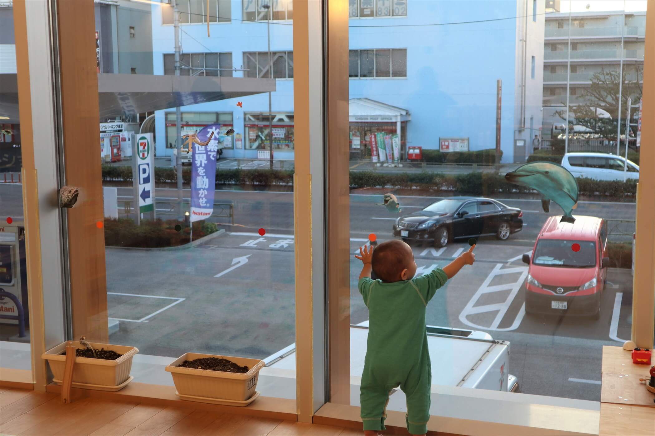 光が降り注ぐ大きな全面ガラス張りの窓は、スタッフも子どもたちも大好きな場所です。見学に来られた保護者の方にも「明るいですね」「清潔感があってよいですね」と、好評なんですよ。窓から外の様子を感じることができますし、先日ある2歳の子が「ここを水族館にしたい!」と言ったので、みんなで魚の絵を貼ったりして、今は窓一面を水族館に見立てています。そういった子どもながらの発想も大事にしてあげたいですよね。