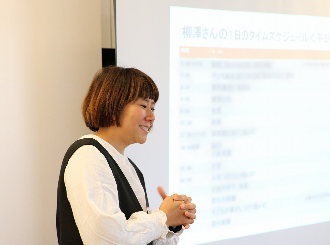 その後は実際に育休から復帰した先輩ママ職員たちによる一日のスケジュール紹介や質疑応答の時間となりました。先輩ママ職員たちの育児をしながら、のリアルな日常の様子に参加者たちの復職後のイメージも具体的になってきたようでした。