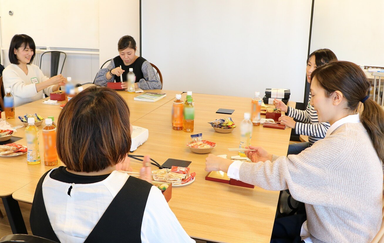 懇談会はみんなで一緒にお弁当を食べて終了。その後、復職後の配属先や働き方など、面談の時間も用意しています。