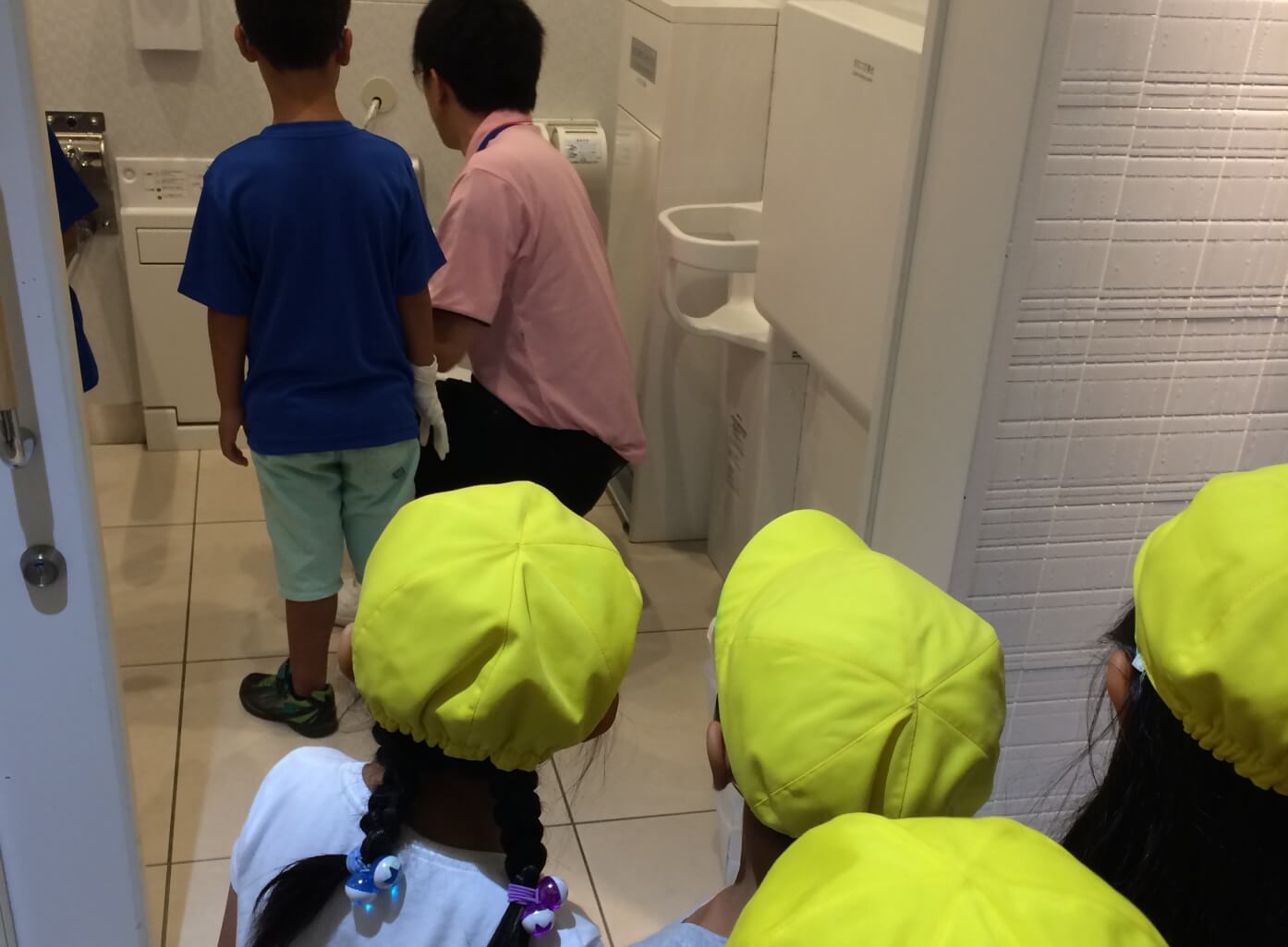 その他、防災センターでは、防犯カメラのモニターを見せてもらうこともありました。エレベーター内の防犯カメラ映像が防災センターにどのように届くのか、その様子を子ども達に解説していただきました。いつも目にしているカメラは何を映していて、それは何のためなのか?を、子どもたちも学ぶことができたようです。