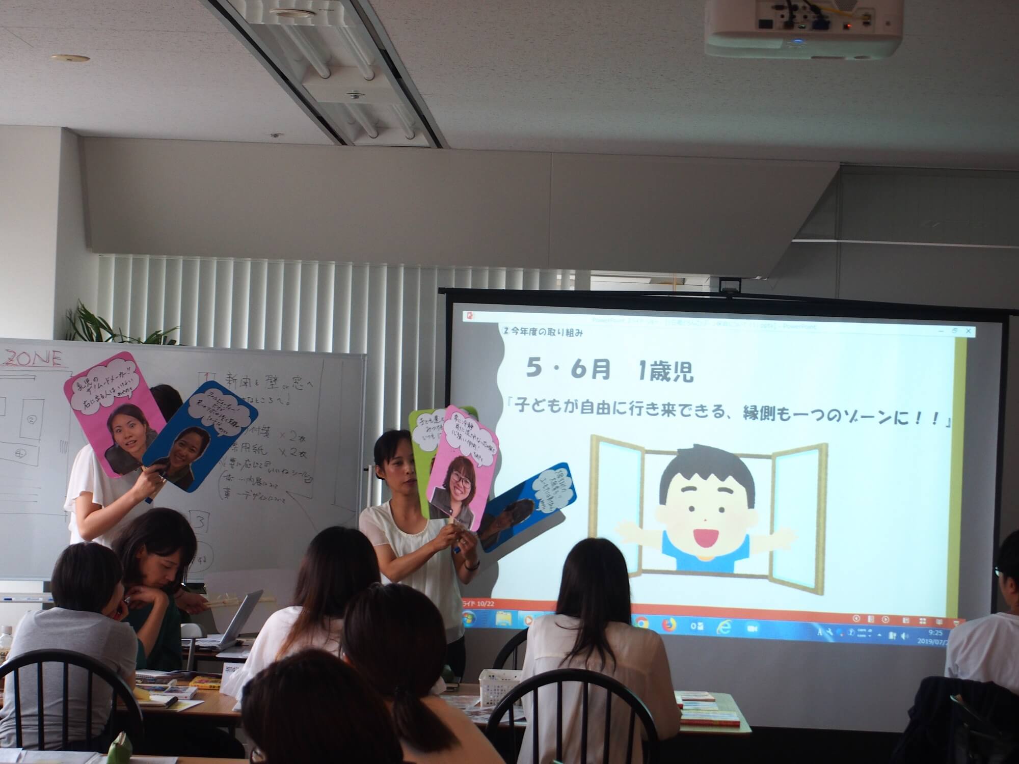 4月からの3ヶ月で特に変化の見られた日高どろんこ保育園(埼玉県日高市)。日高どろんこ保育園は、園舎の作り的に「ゾーン保育」の展開が難しいとされている園。そこで今回は、難しい環境でも実際にどのように「ゾーン保育」が進められたかを、ビデオ発表することになりました。ビデオで園の様子を見てから、主任の古川さん、乳児リーダーの嶋山さんが、ぺープサートを使いながら楽しく現場の声を再現し、職員間のとまどいや課題をクリアするためのさまざまなポイントを発表します。
