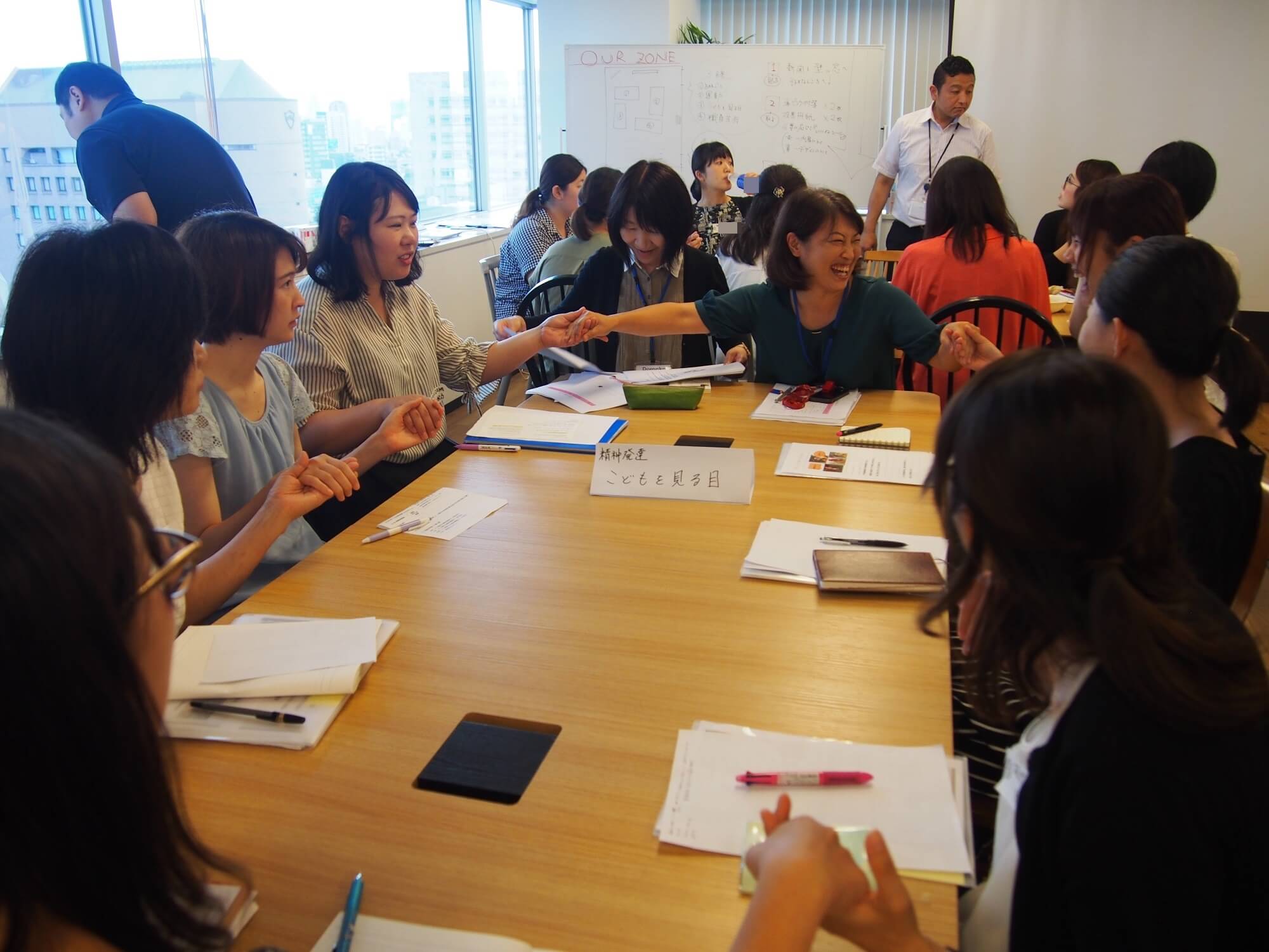 今回は発表だけでなく、「OUR ZONE~012ワクワク研究~」と題した研究を行う時間も設けられました。3ヶ月間で各園から課題として上がった「物的環境:ままごと見たて遊び」「身体発達:運動の物的環境」「精神発達:こどもを見る目」「人的環境:職員への共有方法とマネジメント」の4つのブースに分かれてディスカッション行い、最後には、各ブースの話し合いの結果発表を行います。