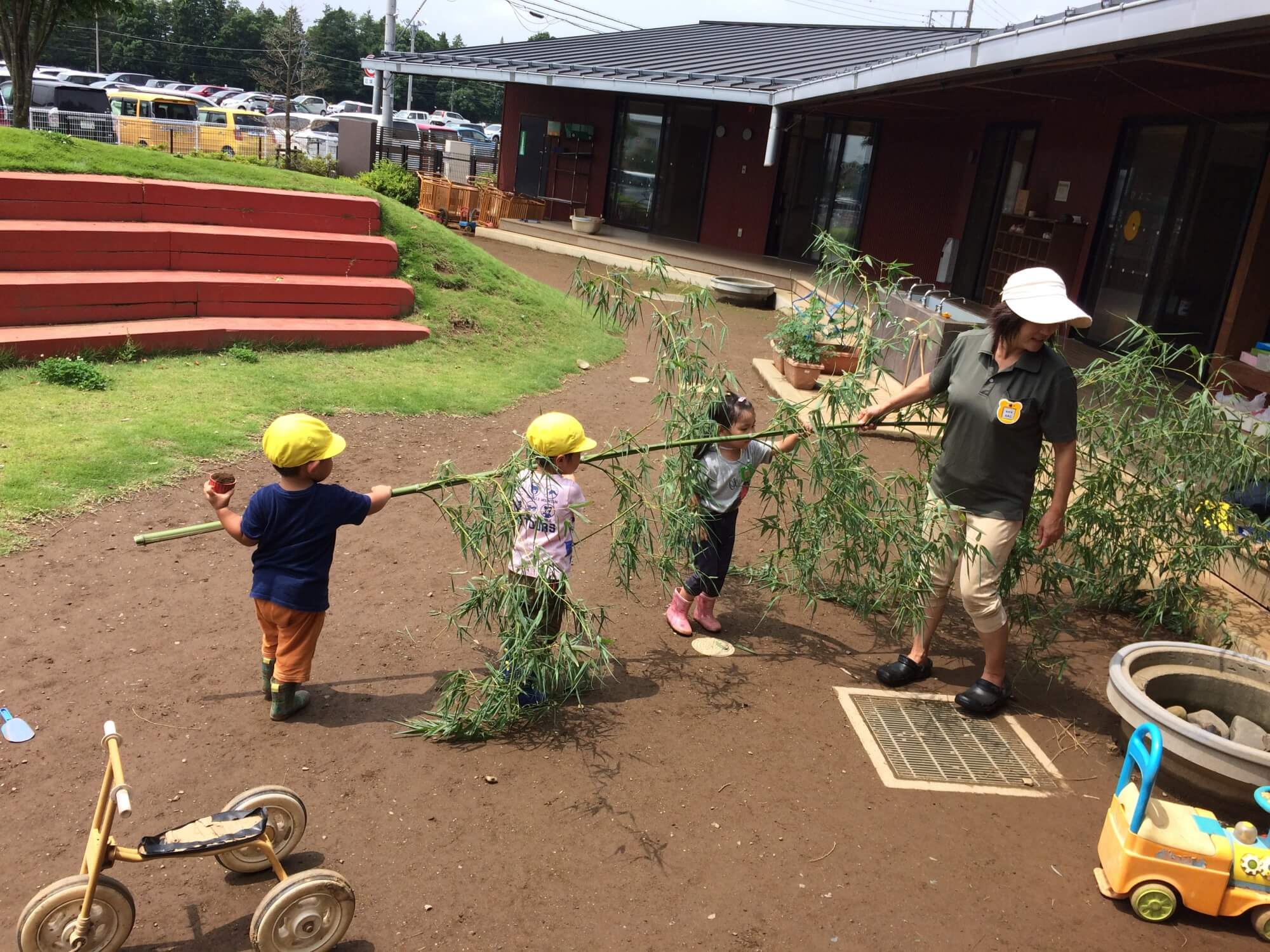 「『商店街ツアー』というと、様々なお店で買い物をする体験と考えがちですが、私たちは保育園の近隣にあるいろいろな施設にお邪魔して、そこで様々な方たちと触れ合う事をメインに考えています。例えば、筑波記念病院に併設されているケアセンターには、度々お邪魔させていただいています。施設内にあるお庭では、散歩で行った時にいつも遊ばせていただいて、おじいちゃんおばあちゃんとお話することも。みなさん、子どもたちが来るのをとても楽しみにしていて、いつもにこやかに出迎えてくださいます。毎日園に給食を配達してくださる病院職員の方の姿が見えると、みんな門のところに駆け寄って、『給食きたよ』と他の子どもたちに知らせ、配達の方に『今日の給食な~に?』などと聞いたりコミュニケーションをとっています」と金田園長。