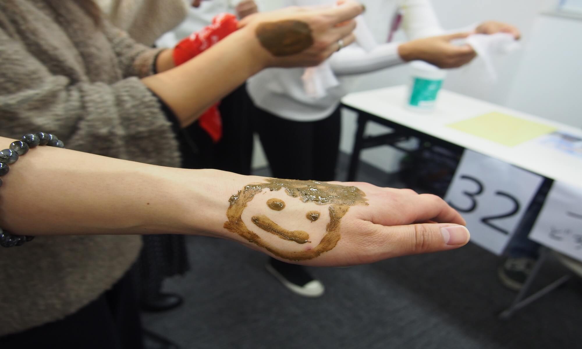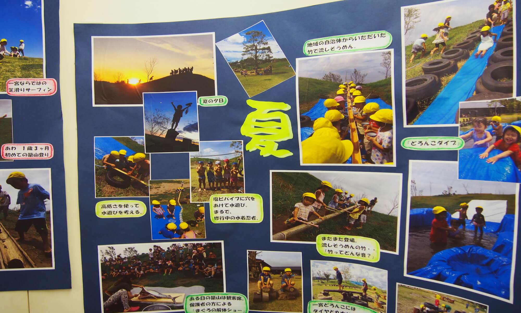 どろんこ会グループで一番広い園庭を持つ一宮どろんこ保育園。保育園のシンボルでもある高さ3mと5mの2つの築山で遊ぶ子どもの様子を、躍動的な写真をたくさん使って紹介しました。「子どもの決定的瞬間を狙っています!」と話す職員の撮った写真は、どれも子どもの様子をいきいきと伝えています。また、どろんこ祭りで使っている泥も持ち込み、実際に手につけて感触を味わえる展示も好評でした。