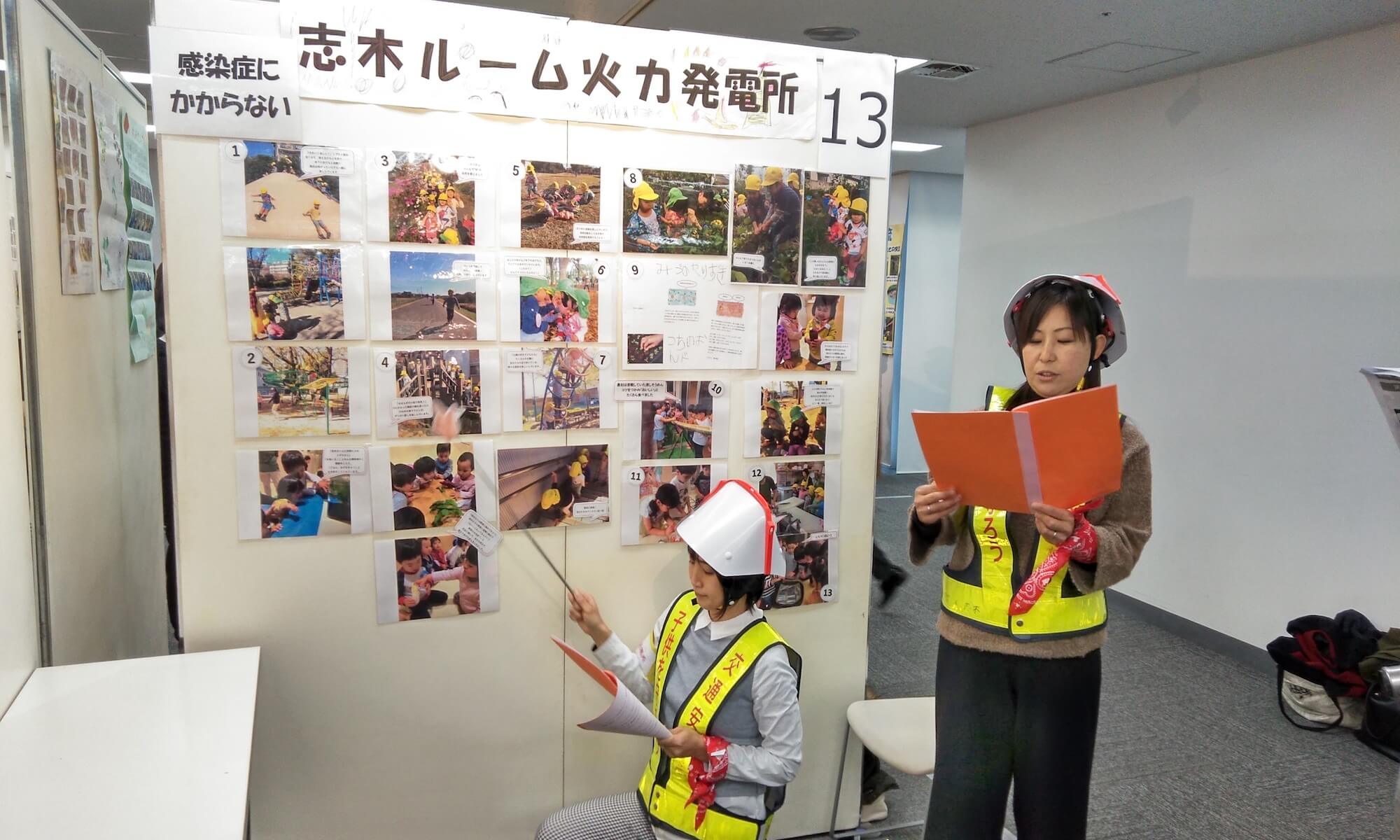 ヘルメットと蛍光ベストを身につけ説明する職員が印象的なメリー★ポピンズ志木ルーム。志木ルームが掲げる「ポジティブ・パワフル・超元気」なエネルギーの源である元気な体づくりの内容がプレゼンされました。また、絵画指導の資格を取得した「ゆうすけ先生」による、アートを通じ保育の幅を広げる活動も発表されました。