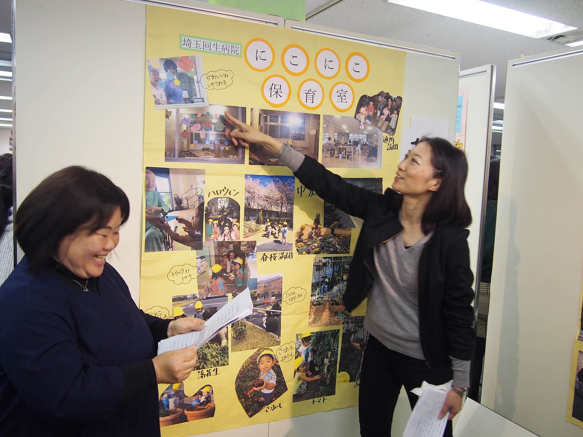 この他にも、朝霞どろんこ保育園(埼玉県朝霞市)の保護者と繋がる懇談会資料のまとめ方や、ペープサートを使って劇仕立てに畑での活動を紹介したP’sスマイル(神奈川県横浜市)、園舎に見立てた大きな資料を作った武蔵野どろんこ保育園(東京都武蔵野市)など、それぞれに工夫が凝らされ、見応えのある発表が並びました。