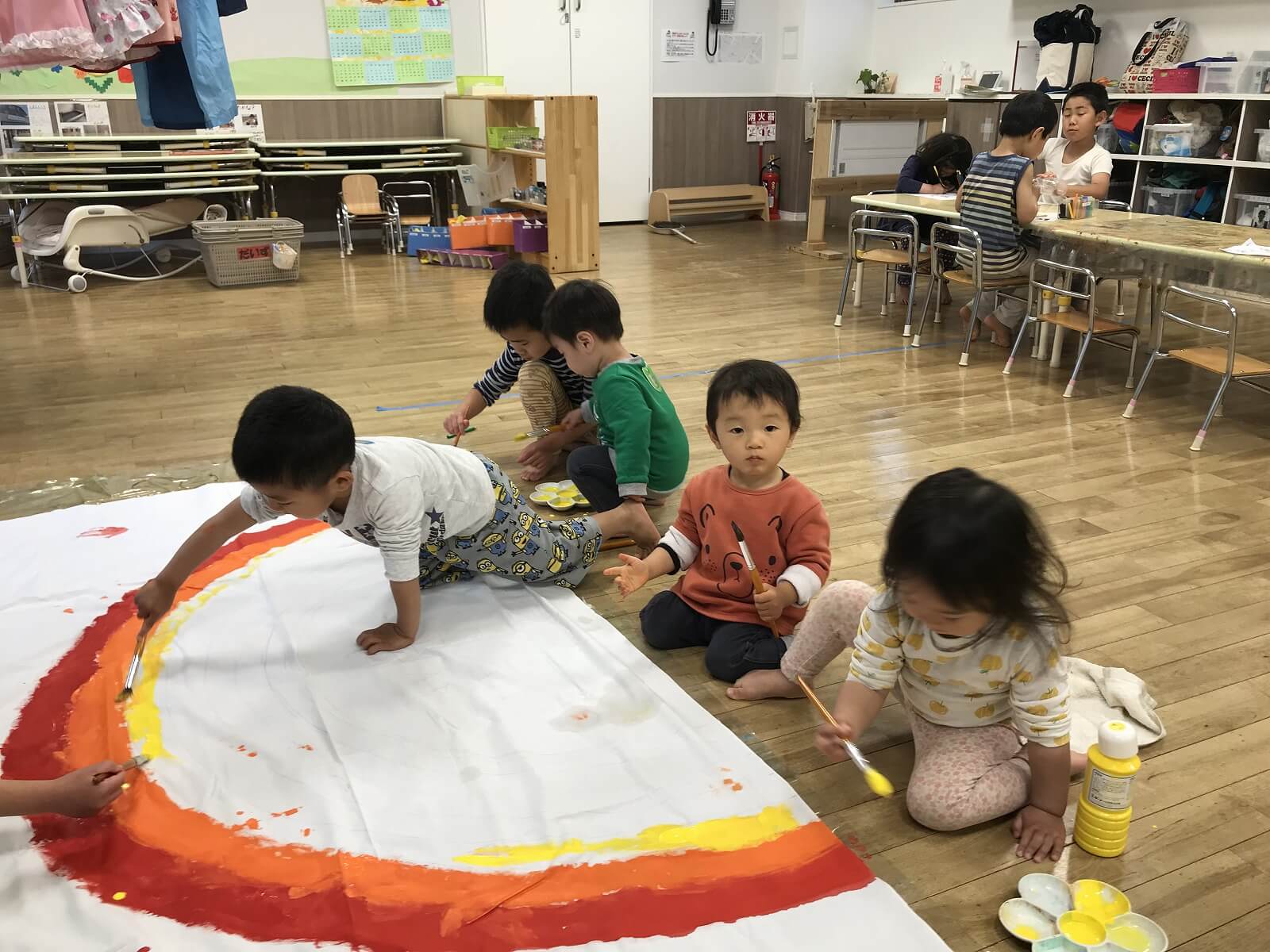 多くの方々にご家庭での保育にご協力をいただいているので、いつもよりも少ない人数の子ども達でしたが、白い布地のキャンバスに色を重ね、ダイナミックな虹を完成させました。
