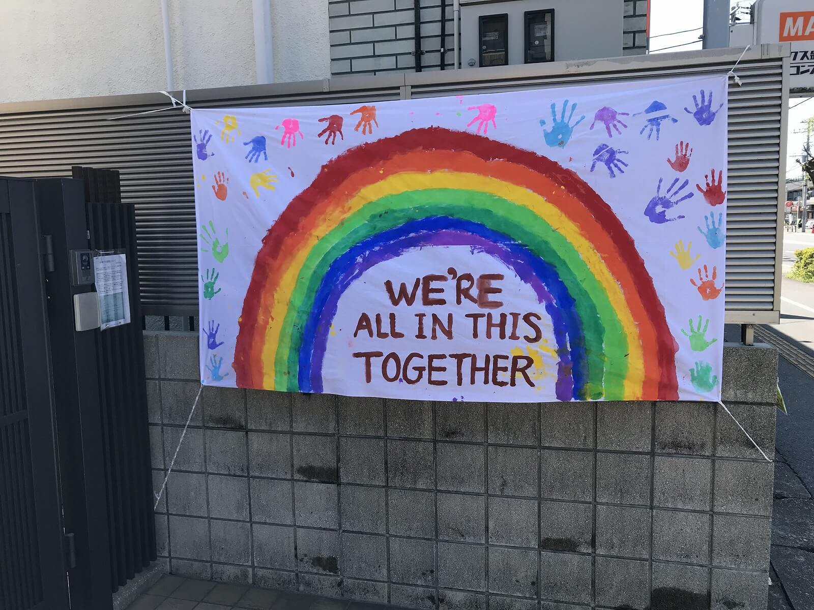 虹と手形に添えられたメッセージ「WE’RE ALL IN THIS TOGETHER(私たちはいつも一緒です)」。発起人の吉野さんが付け加えたメッセージです。保育園に来られない園児に対してだけでなく、この虹を目にした道行く人達にも「私たちはいつも一緒だよ!」「共に乗り越えよう!」という想いが込められています。