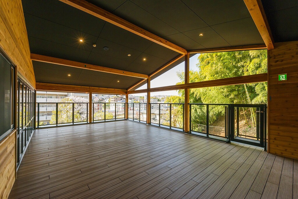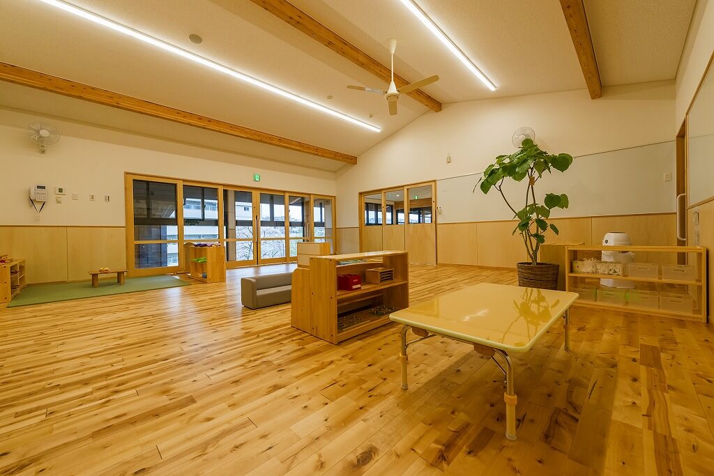 定員90名、それぞれの保育室は自然光が入り明るく、温かみのある木材で作られています。晴れた日でも雨の日でも縁側給食が楽しめるように、広いバルコニーもあります。