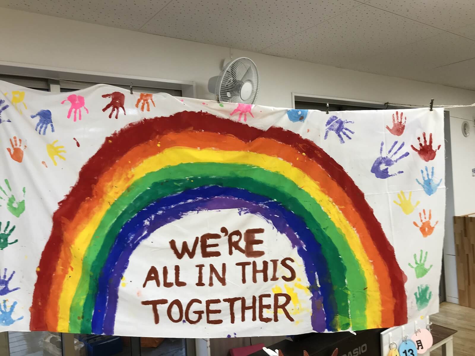 虹が完成すると「仲町どろんこ保育園にキレイな虹が出てるよ!」「コロナに負けないで頑張ろうね~!」と地域の方に縁側から声をかけていただいたり、東武東上線を利用して通勤している方も応援できたりするよう、電車の車窓からもよく見える場所に飾りました。