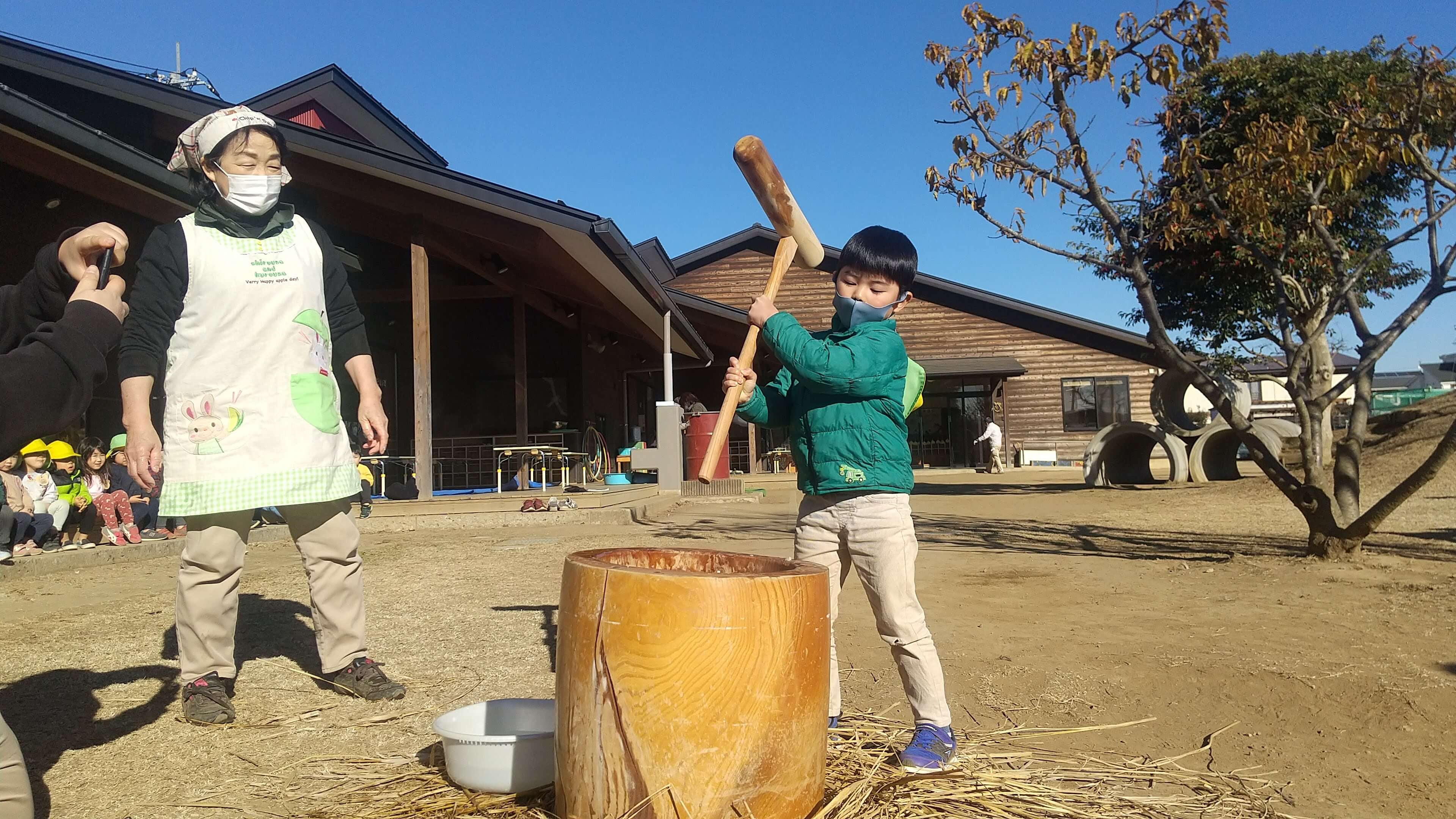 毎年、つくばどろんこ保育園では杵と臼を使って、子ども達と一緒に先生達も粉まみれになり餅つきを楽しんでいます。