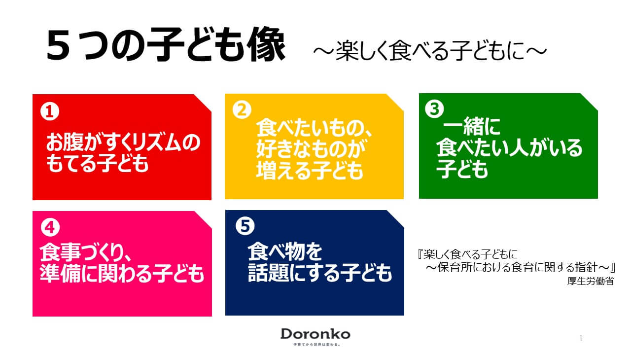厚生労働省では、食育の目標実現に向けて「5つの子ども像」という具体的な子どもの姿を示しています。この「5つの子ども像」とは、保育所保育指針にある保育の目標を「食育」の観点から表したものです。
