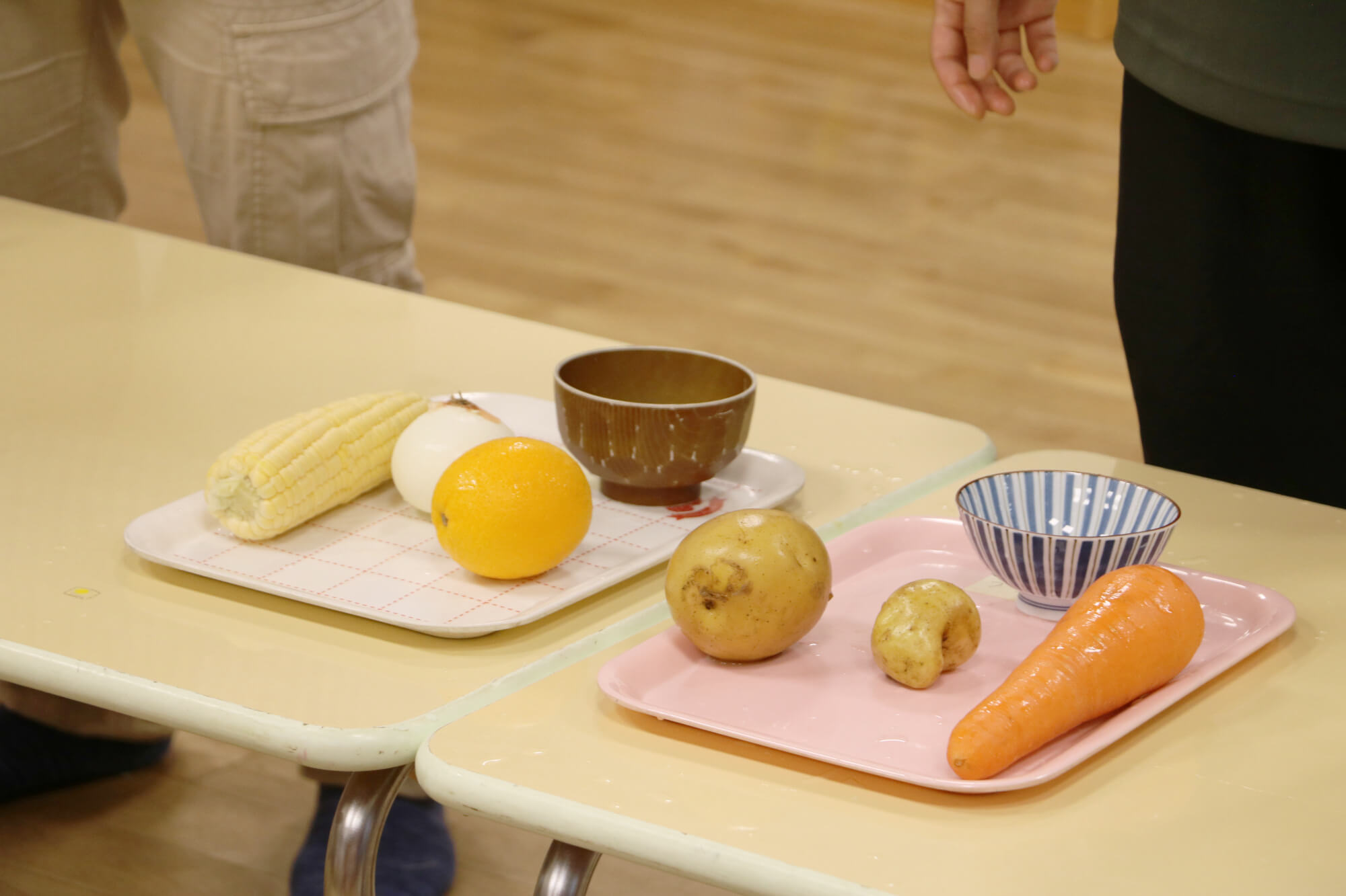 まずは身近なものということで、食器、野菜、果物を用意しました。