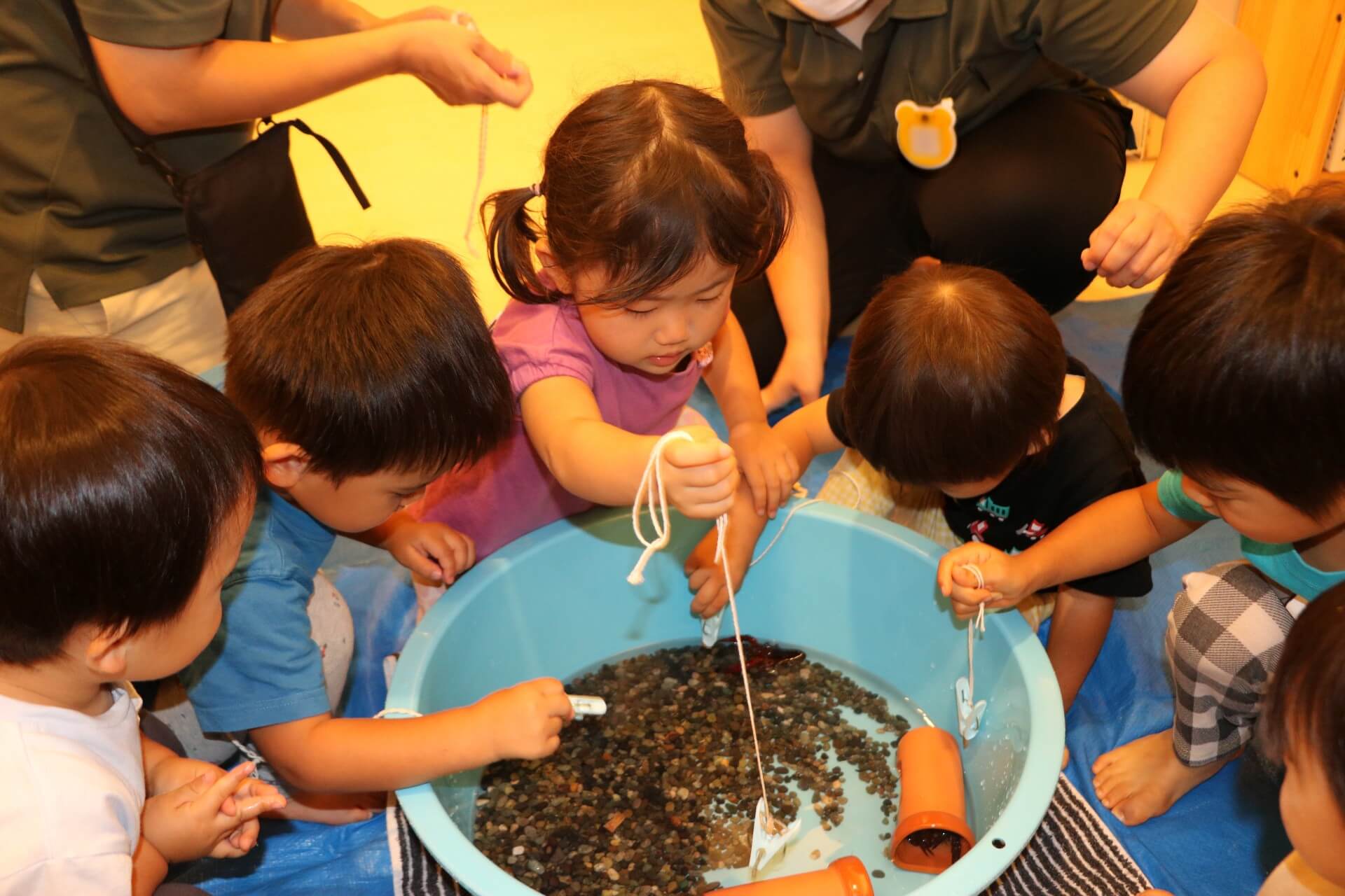大きなたらいに入ったザリガニを初めて見た子どもたちは驚きとうれしさの入り混じった表情。さきイカを結びつけた小さな釣り竿を持つと、ザリガニの動きに興味津々。1歳児も寄ってきて、「何だこれは」と言わんばかりにザリガニをじーっと見つめます。