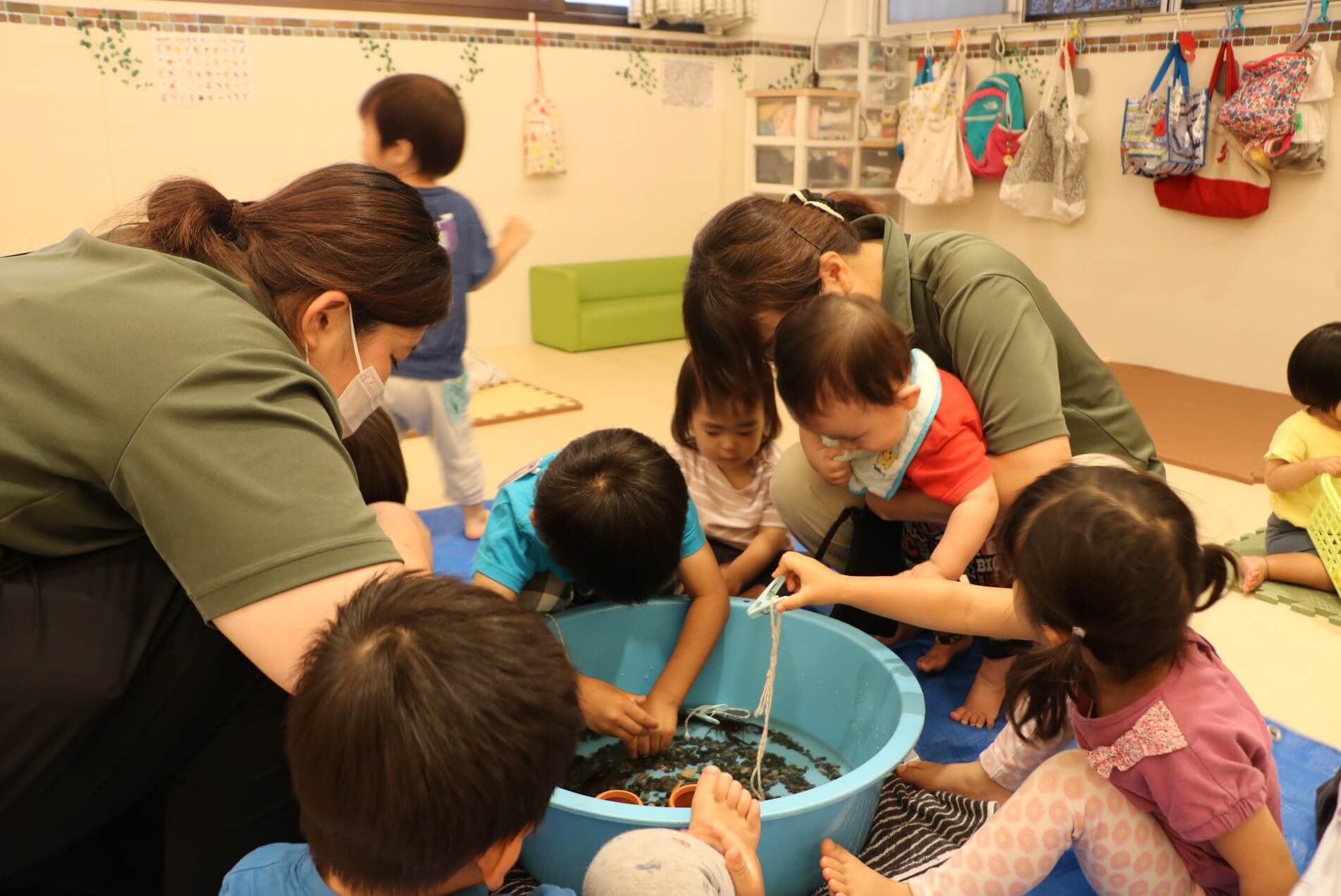 スタッフも同じ想いをもっています。今回の活動を提案した山中さんは、なぜザリガニ釣りだったのか、理由をこう語ります。「以前、同じく園庭のないメリー★ポピンズ 成増ルーム(東京都板橋区)に在籍していた時に、室内でザリガニ釣りをしたことがありました。その時、大人が動くことで子どもたちに体験の機会を創ることができることを実感したため、中板橋ルームでも挑戦してみようと思いました」