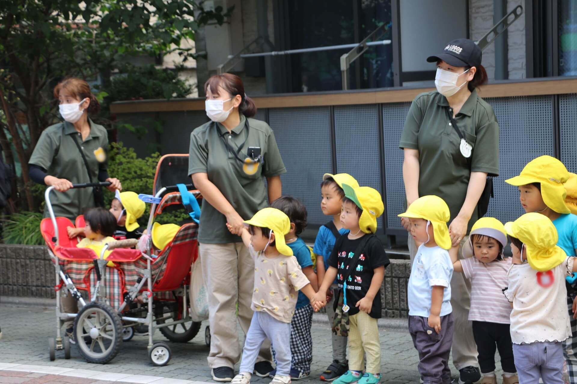 ザリガニ釣りの後は、散歩に出かけました。中板橋ルームではどろんこの子育てで身につく6つの力を育む活動をとても大事にしています。金澤施設長は「乳児保育においても、五感を刺激する体験はとても重要です。一日の中でも太陽の光の感じ方、風の感じ方は違います。そういった自然からの刺激を得るためにも午前、午後と散歩に出ています」と言います。すぐ近くを流れる石神井川沿いを歩きながら、子どもたちは季節の移ろいを感じているそうです。