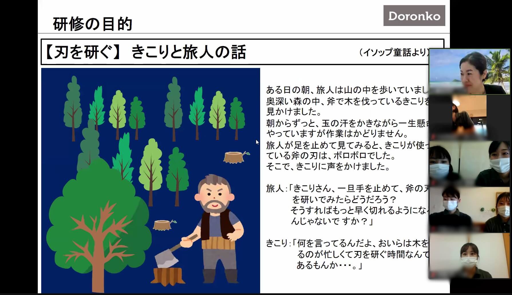 川村さんはまず、イソップ童話の『きこりと旅人の話』の読み聞かせを始めました。あわただしい日常から、研修に入るための心の準備ができるようにするためです。この話は心理テクニックや人材育成の場面で用いられるもので、入社後、ひたすら走り続けてきたスタッフに向けて、ここまでの歩みを整理することで次の成長につなげてもらいたいというメッセージも込められています。