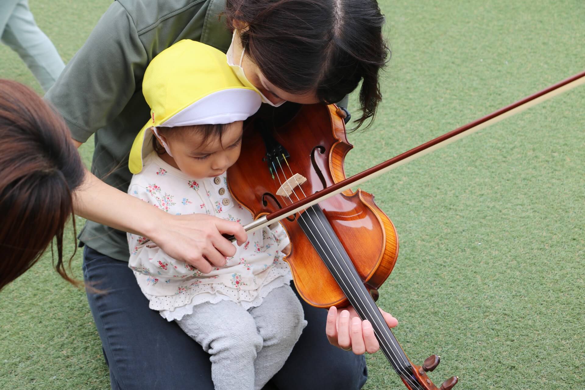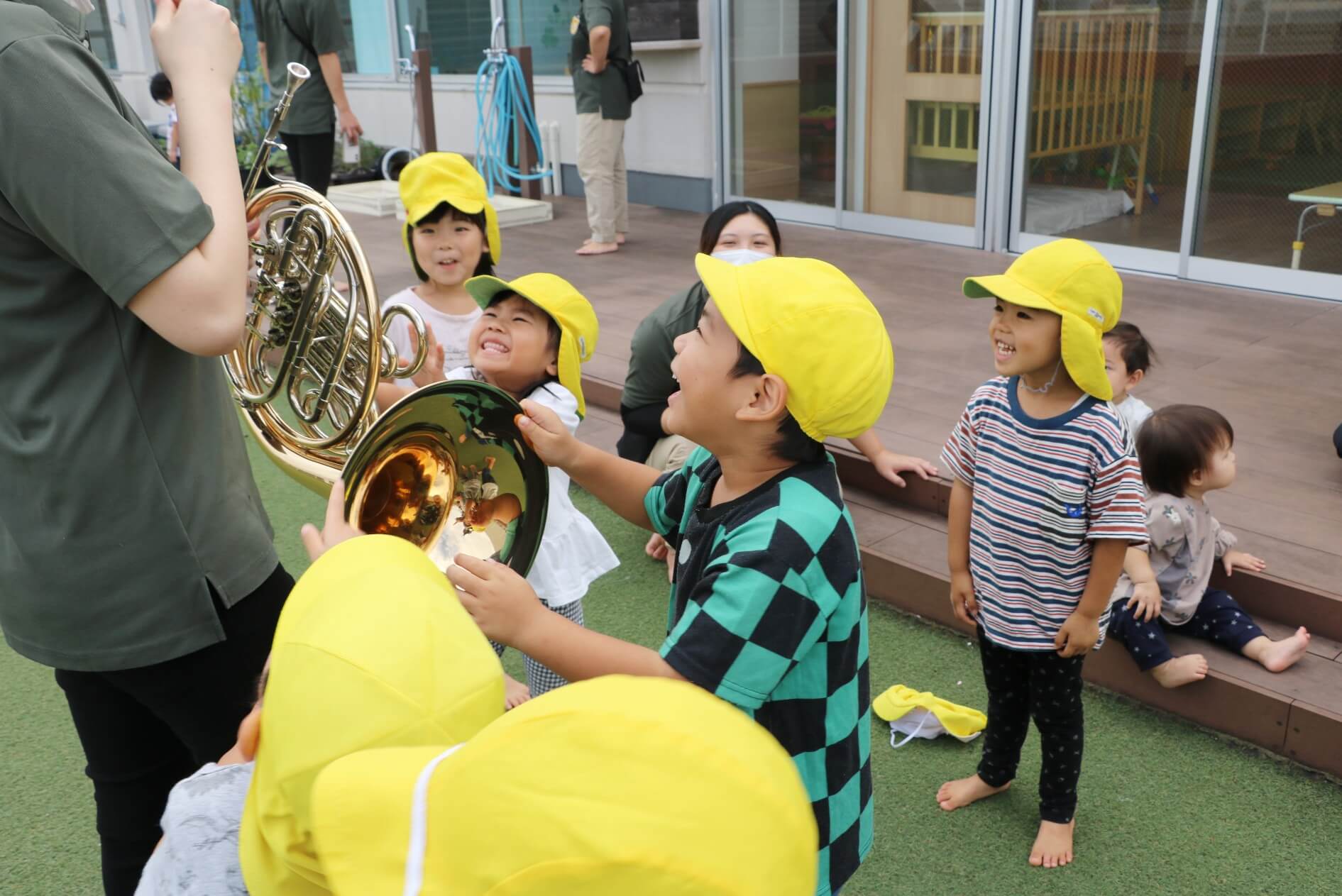 日ごろなかなか触れることのない楽器の本物の音を体験した子どもたち。このように、どろんこ会グループの各施設は、スタッフの得意を生かしつつ、10よりも100の経験の機会を創り出す工夫を重ねています。
